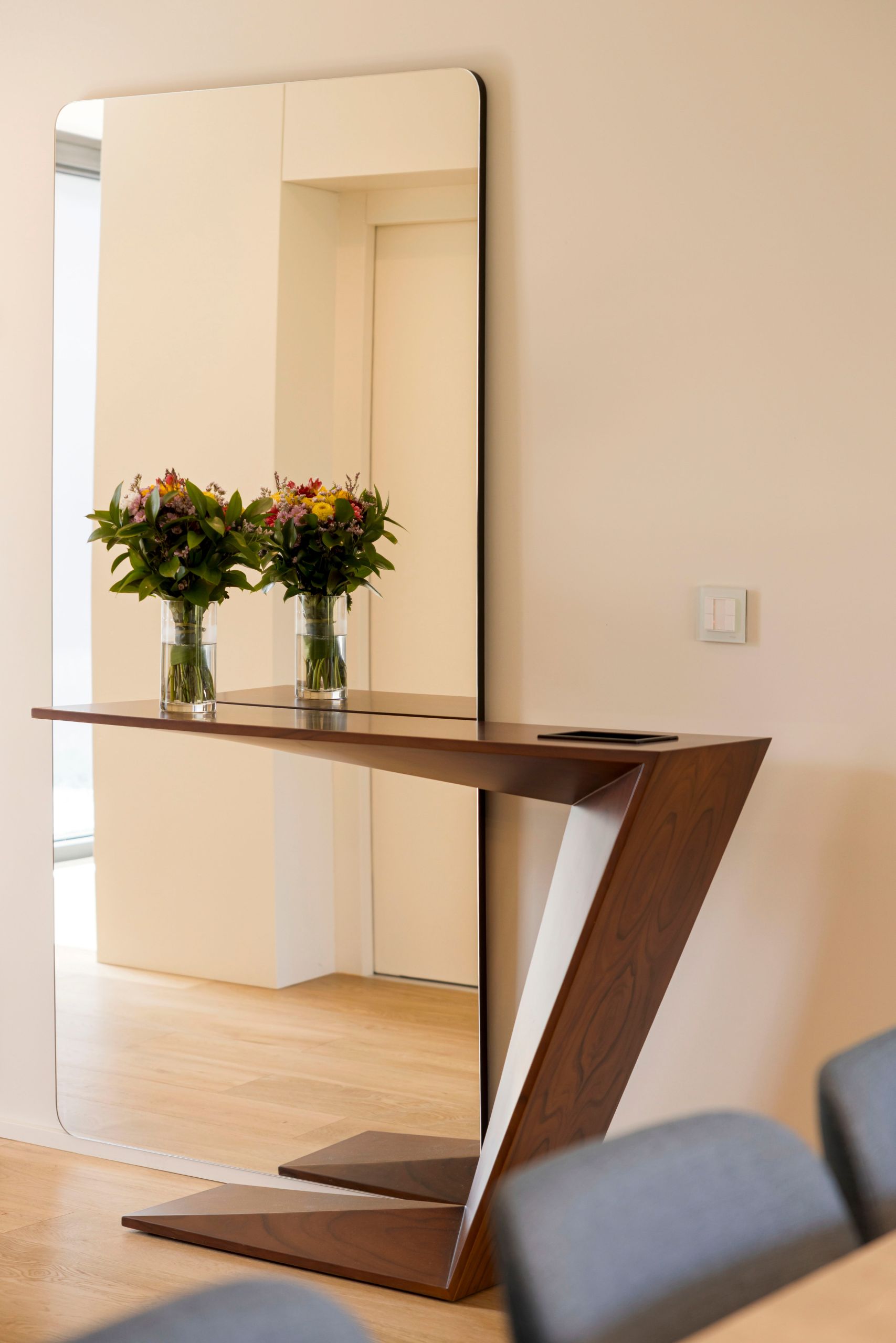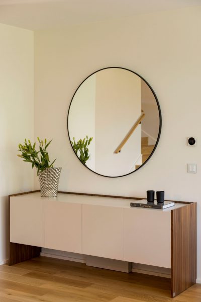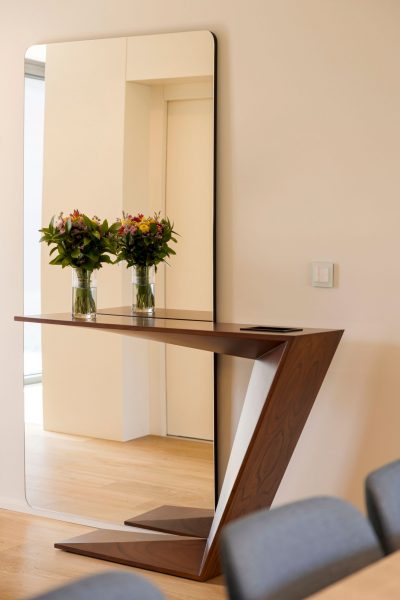 The console’s straight lines contrast with the soft contours of the mirror placed behind it, creating a visual dialogue that softens the composition and enhances the sense of openness. This pairing has the ability to transform a small entryway into a bright, uncomplicated space.