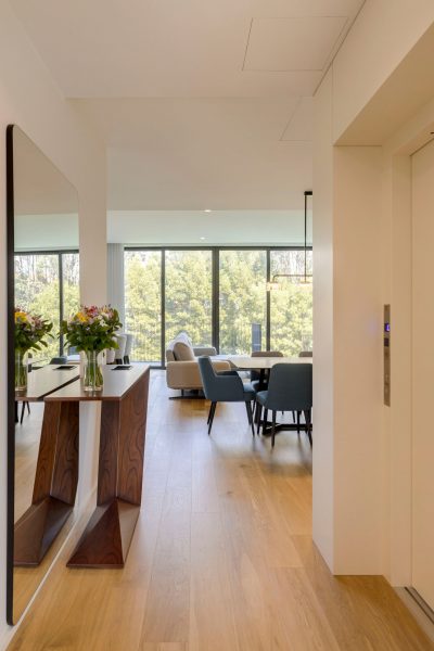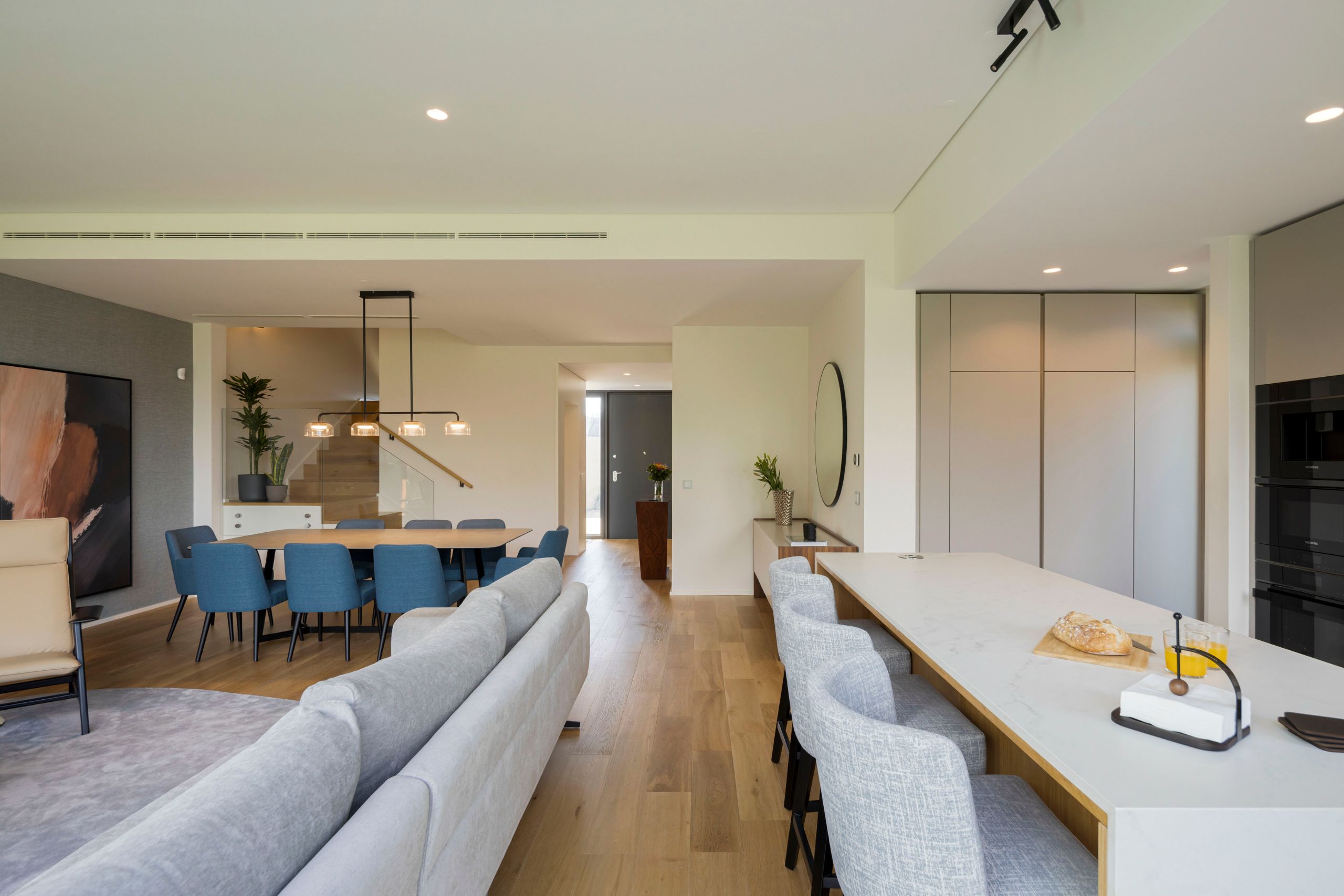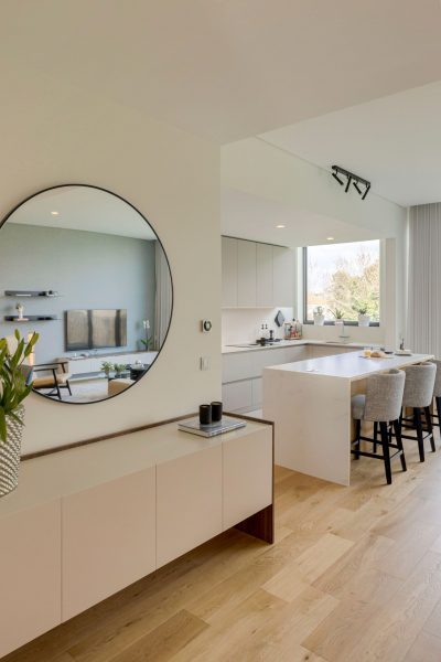 Rooted in a clean and timeless aesthetic language, the project favors refined lines and balanced volumes, an approach immediately visible in the entrance hall. The custom‑designed asymmetrical console subtly defines the area, even within the open‑concept layout, and incorporates a built‑in niche that supports daily routines, offering a place to set down keys and small objects.