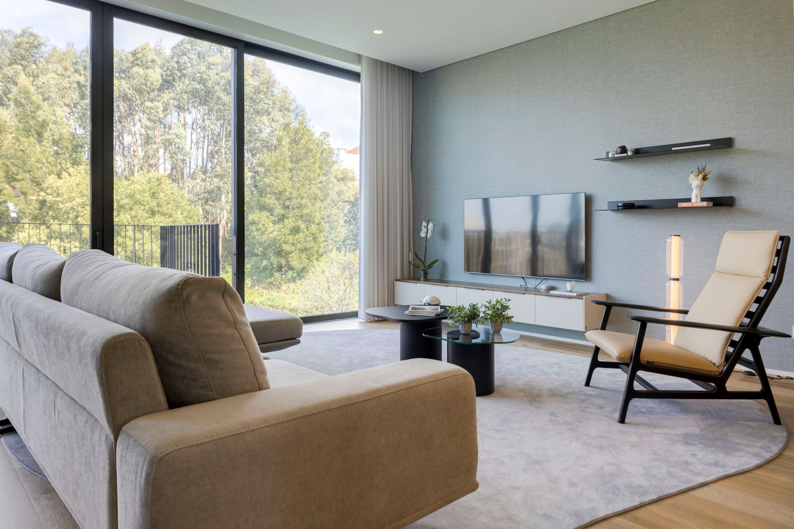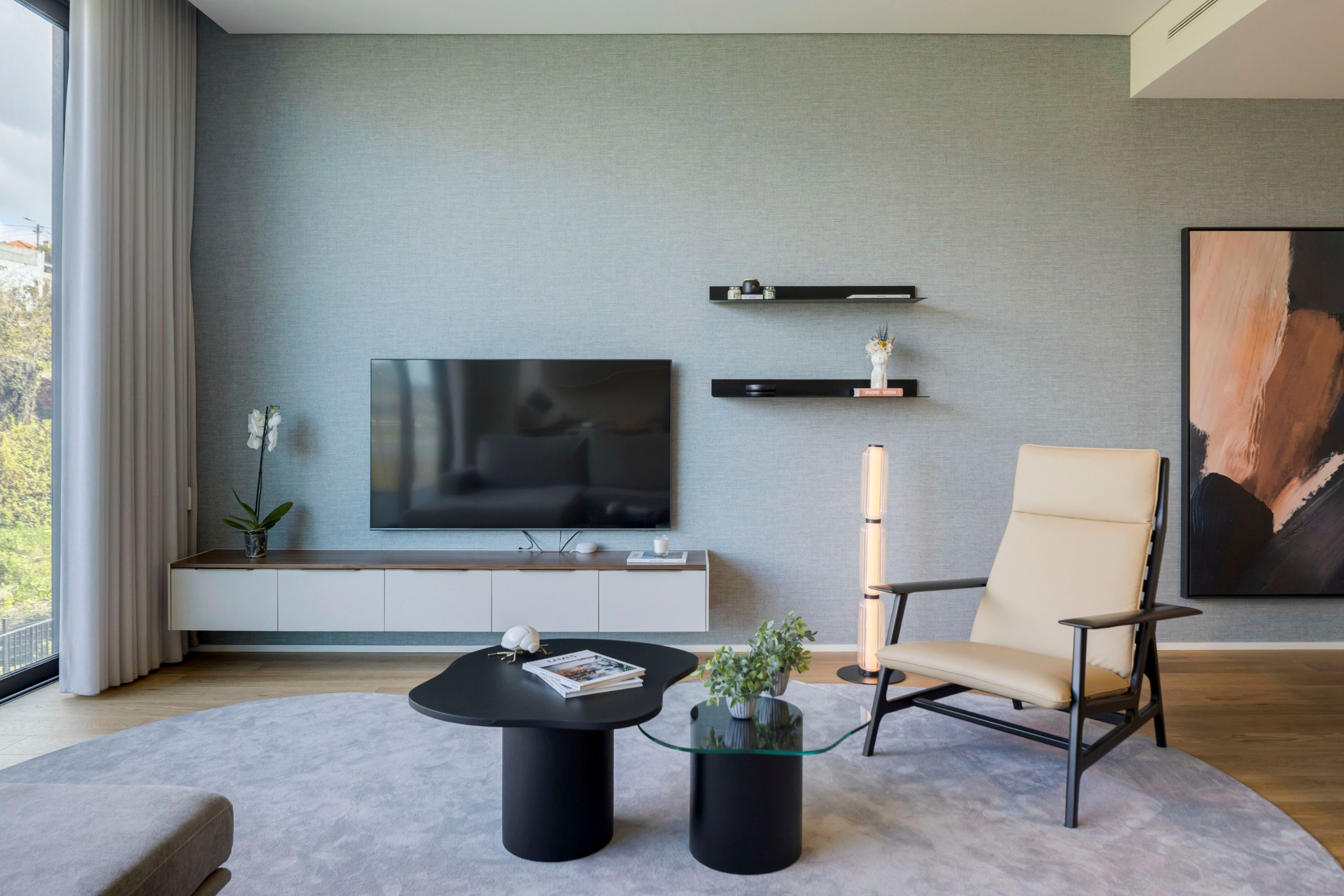 In this modern living room, the Landform TV unit acts as the guiding element, defining the arrangement of the remaining furniture. The neutrality of the gray sofa and rug is complemented by the Ripa armchair, whose dark oak structure and leather finish introduce depth and texture. This reading nook is softly illuminated by the floor lamp, while the Natur side tables add functionality without compromising visual lightness.