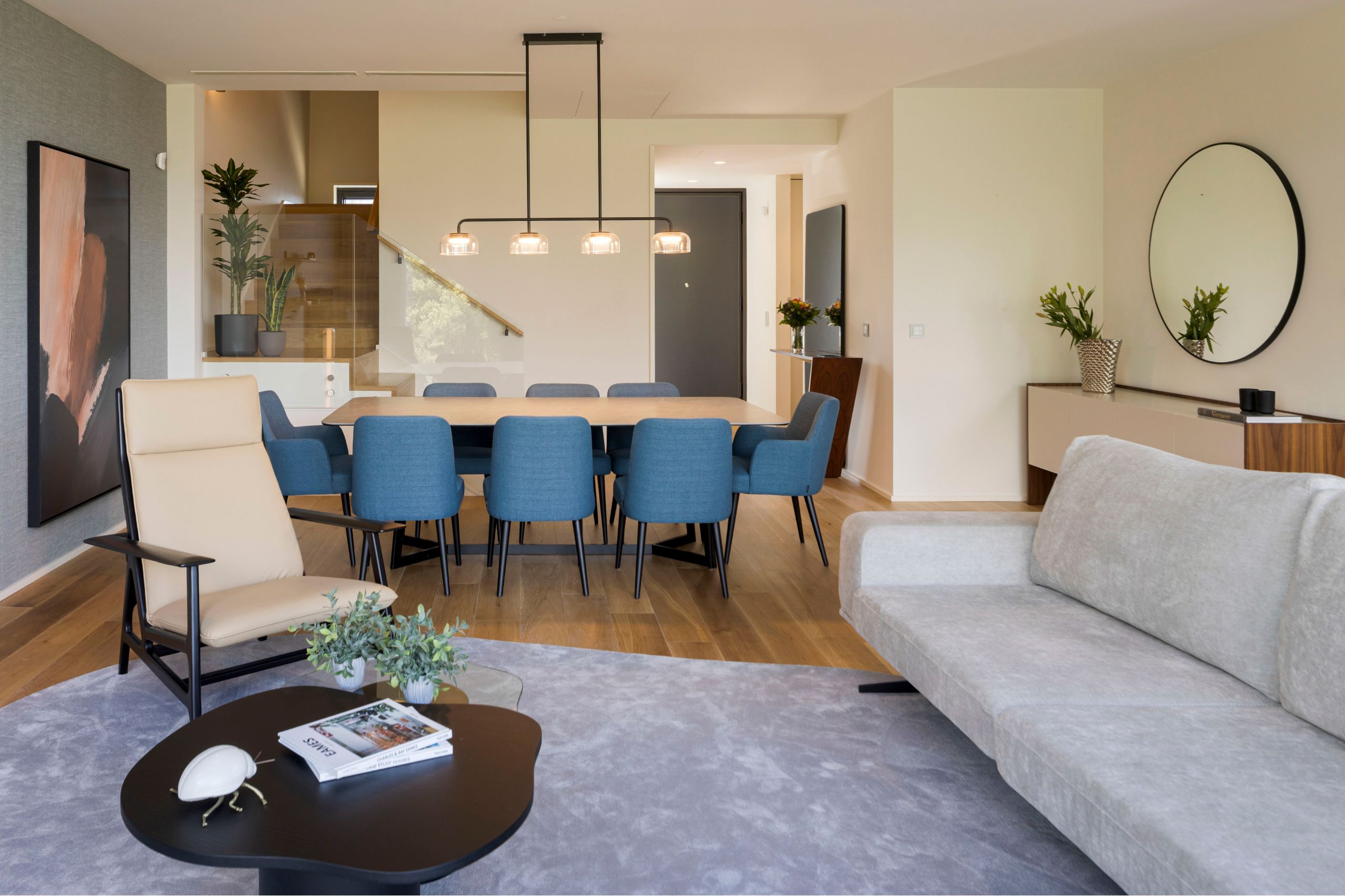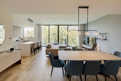 The open‑concept social area was envisioned as the heart of the home, a spacious, fluid environment that encourages moments of connection and shared living. The interplay between the living room, dining room, and kitchen creates a visual continuity that reinforces a sense of modernity and comfort.