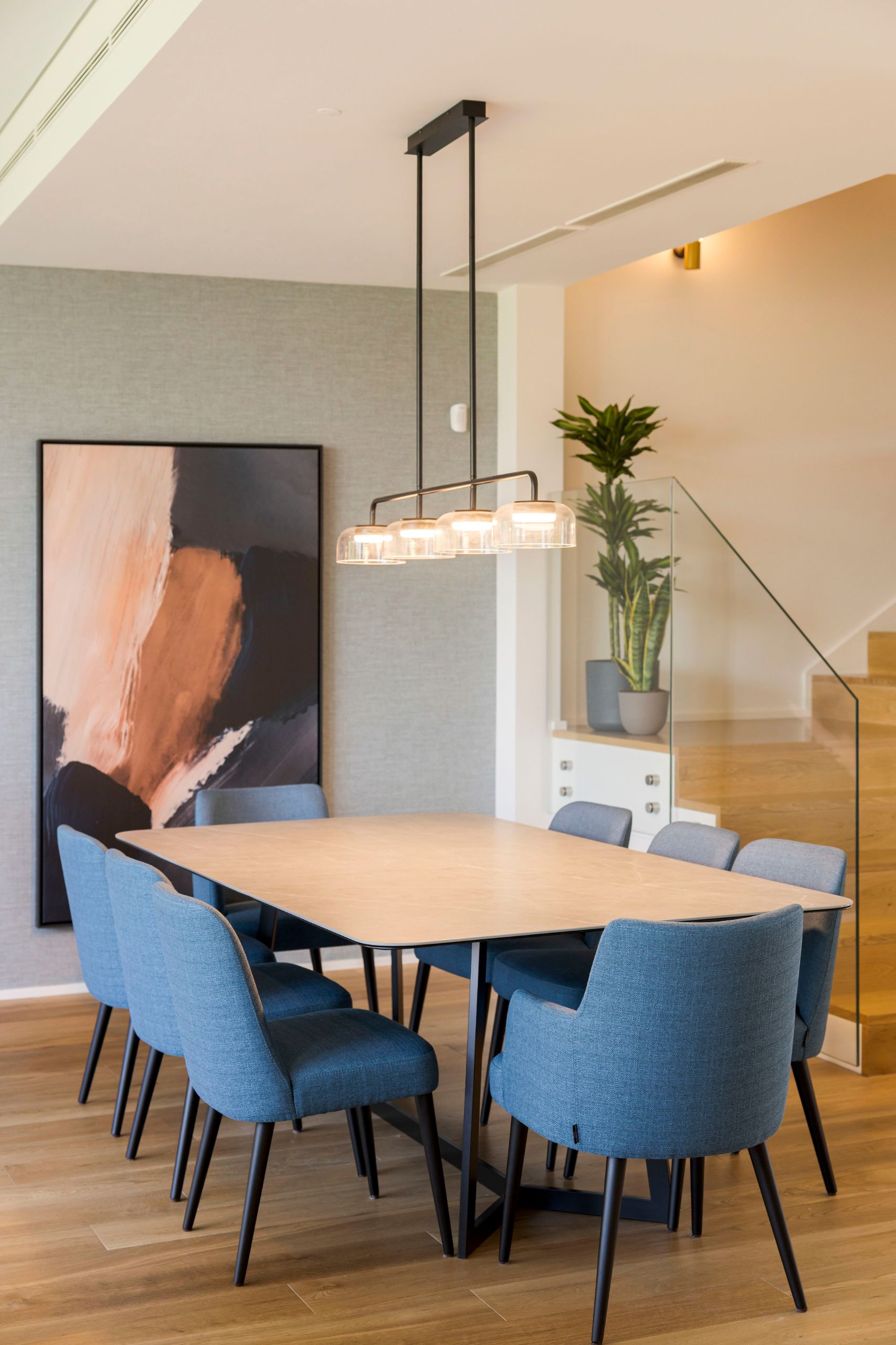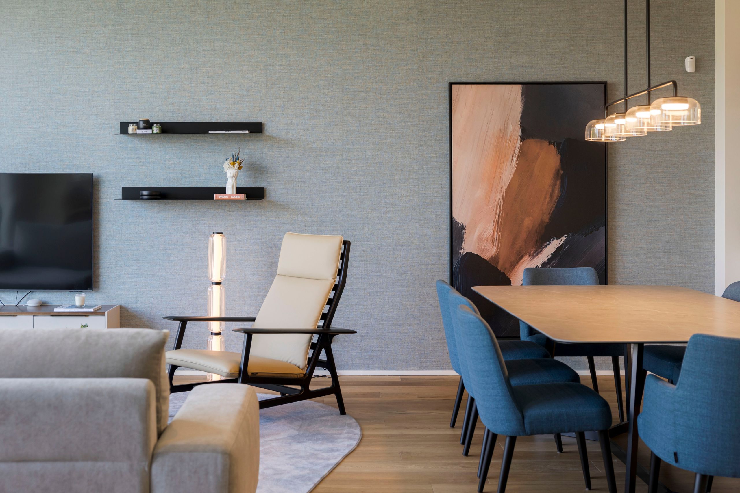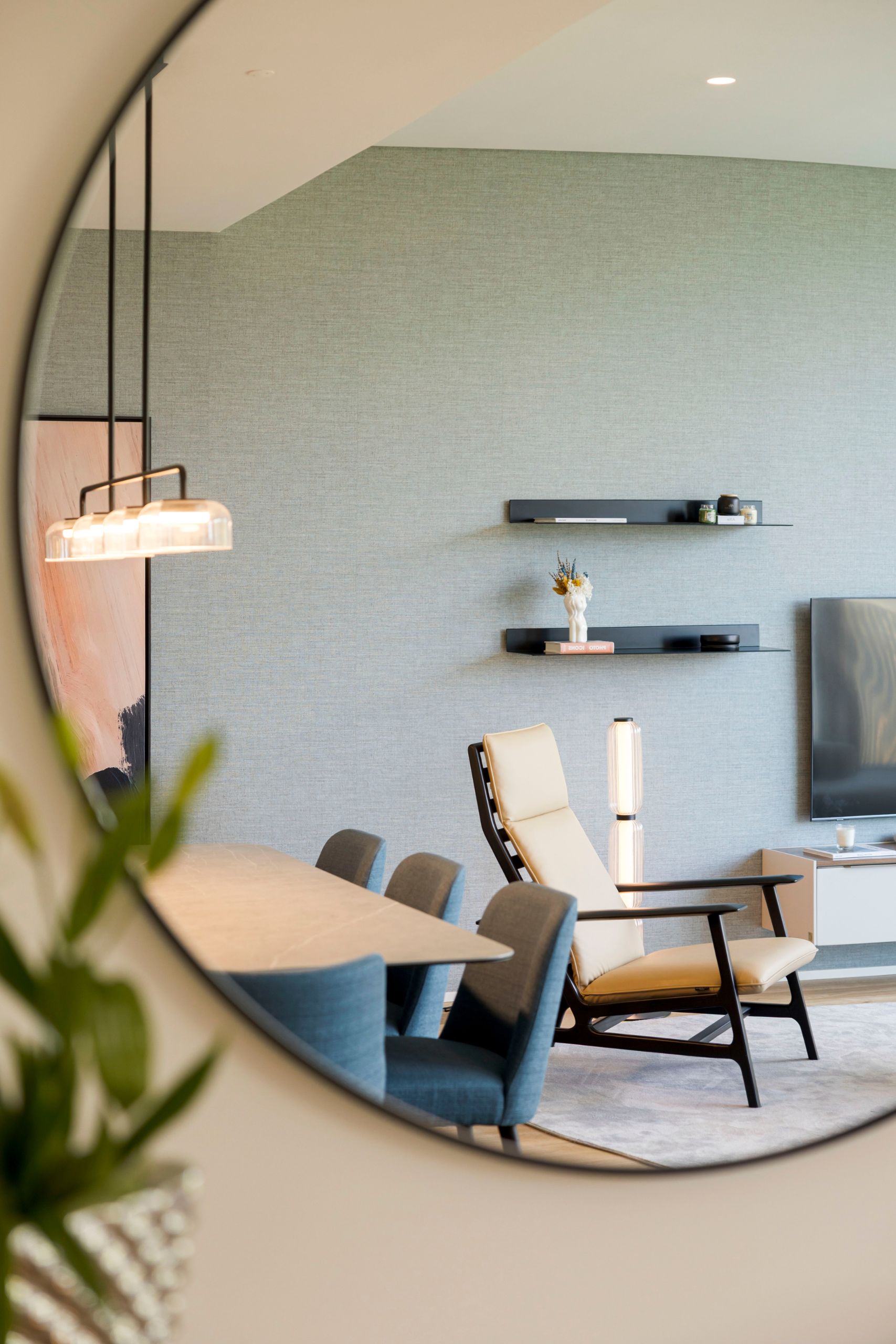 The dining room reveals a bolder attitude, marked by the Maple Kelly chairs in a sophisticated mineral blue, which create a stunning dialogue with the veining of the table. Storage is ensured by the Her sideboard, with softly lacquered beige doors, elegantly complemented by the Niagara mirror. An abstract canvas completes the composition, mirroring the chair fabric’s tone and balancing it with warm pinkish nuances.