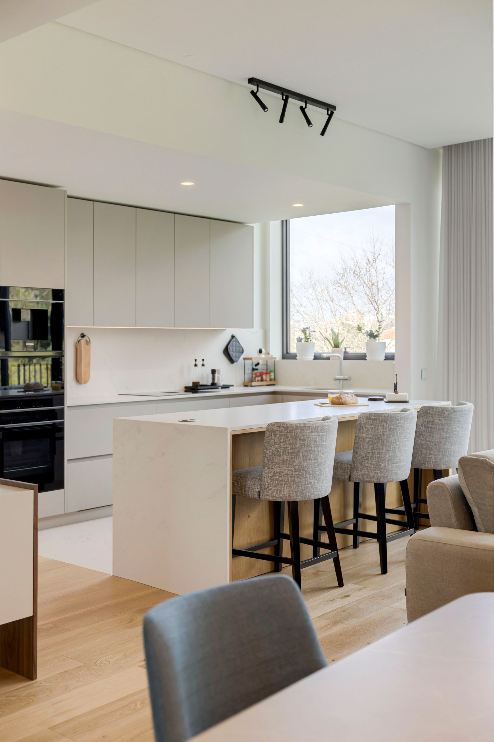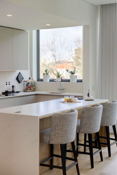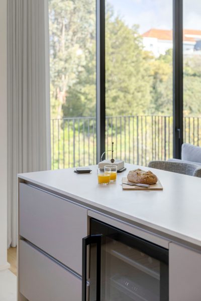 The kitchen, discreetly tucked behind the living room, embodies the essence of modern kitchens: clean lines, intuitive functionality, and a refined aesthetic. Fully equipped for everyday demands, it features an island that combines storage and practicality, an ideal spot for quick meals, paired with the Milos bar stools.