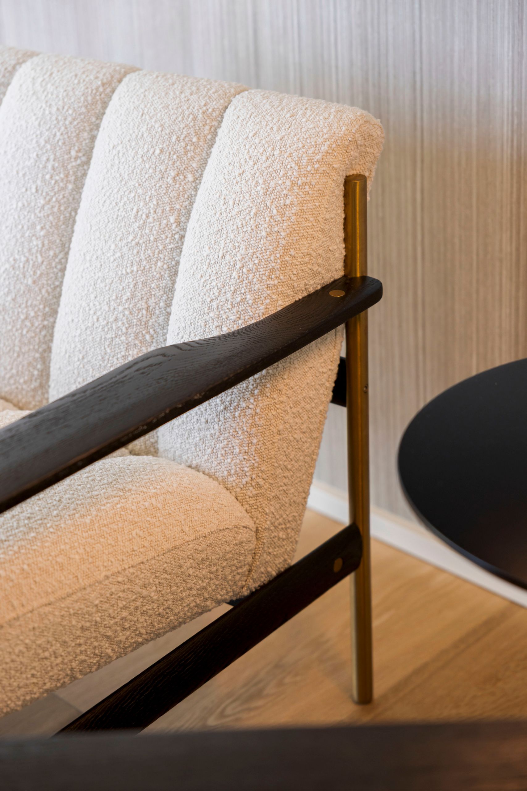 On the opposite side, a set of bouclé-upholstered armchairs invites short breaks between meetings, creating a relaxed corner that balances the working environment. In this setting, the Olivier side table stands out for its functionality, taking up only the minimum possible space in order to preserve a light, unpretentious aesthetic.