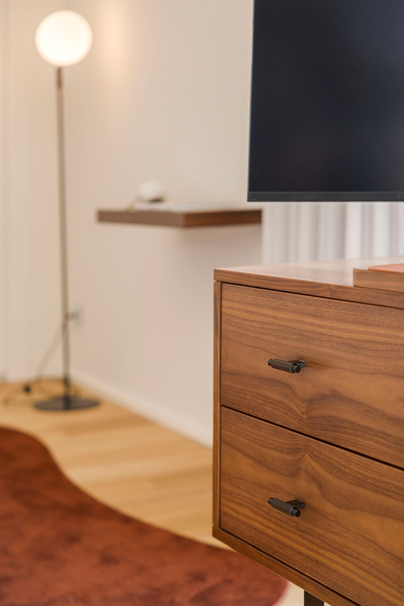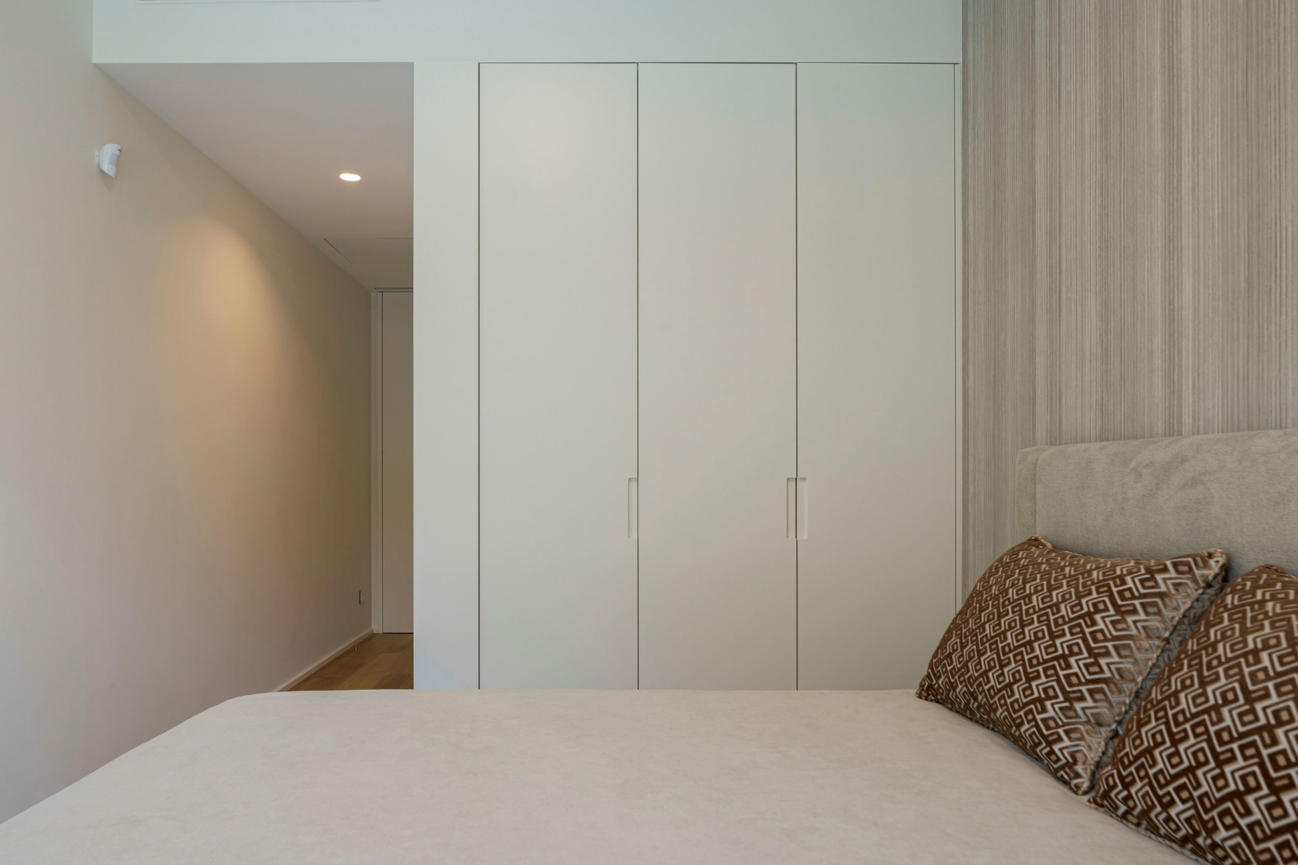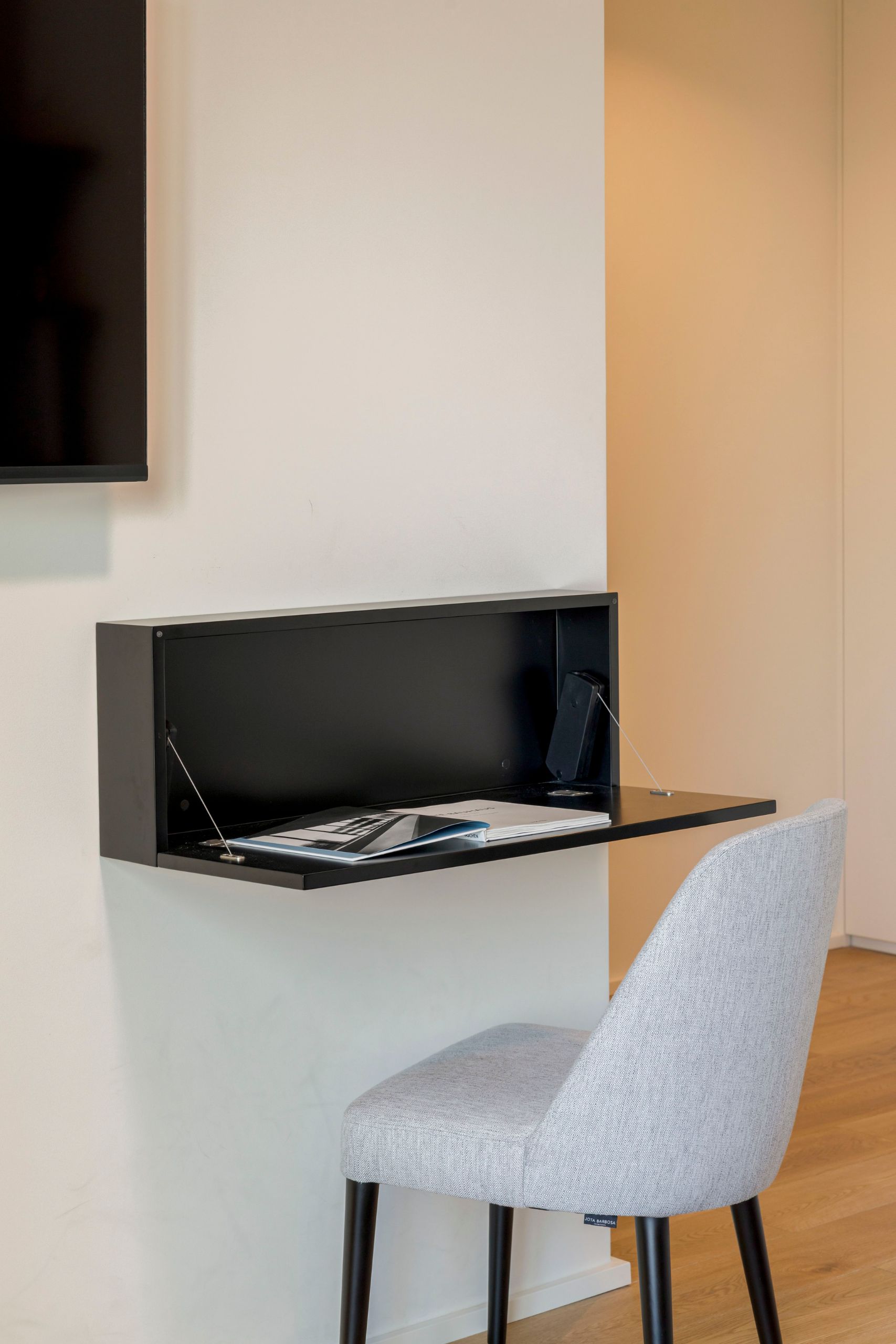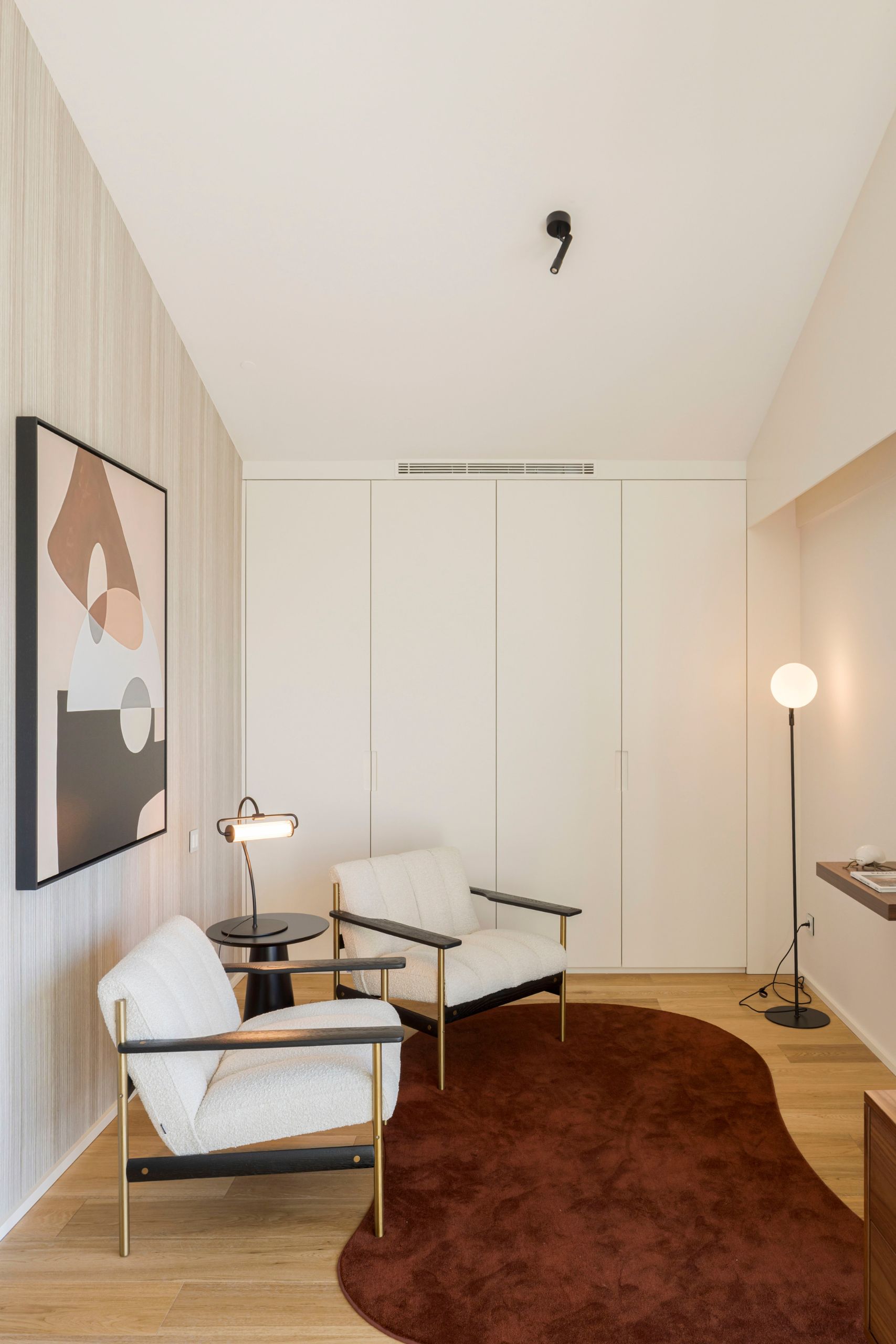 Despite the reduced area, integrating a workspace was essential. A retractable desk was created, easily folded away when not in use, preserving the room’s visual lightness. A practical and discreet solution, designed for a bedroom that blends personal expression, comfort, and versatility.