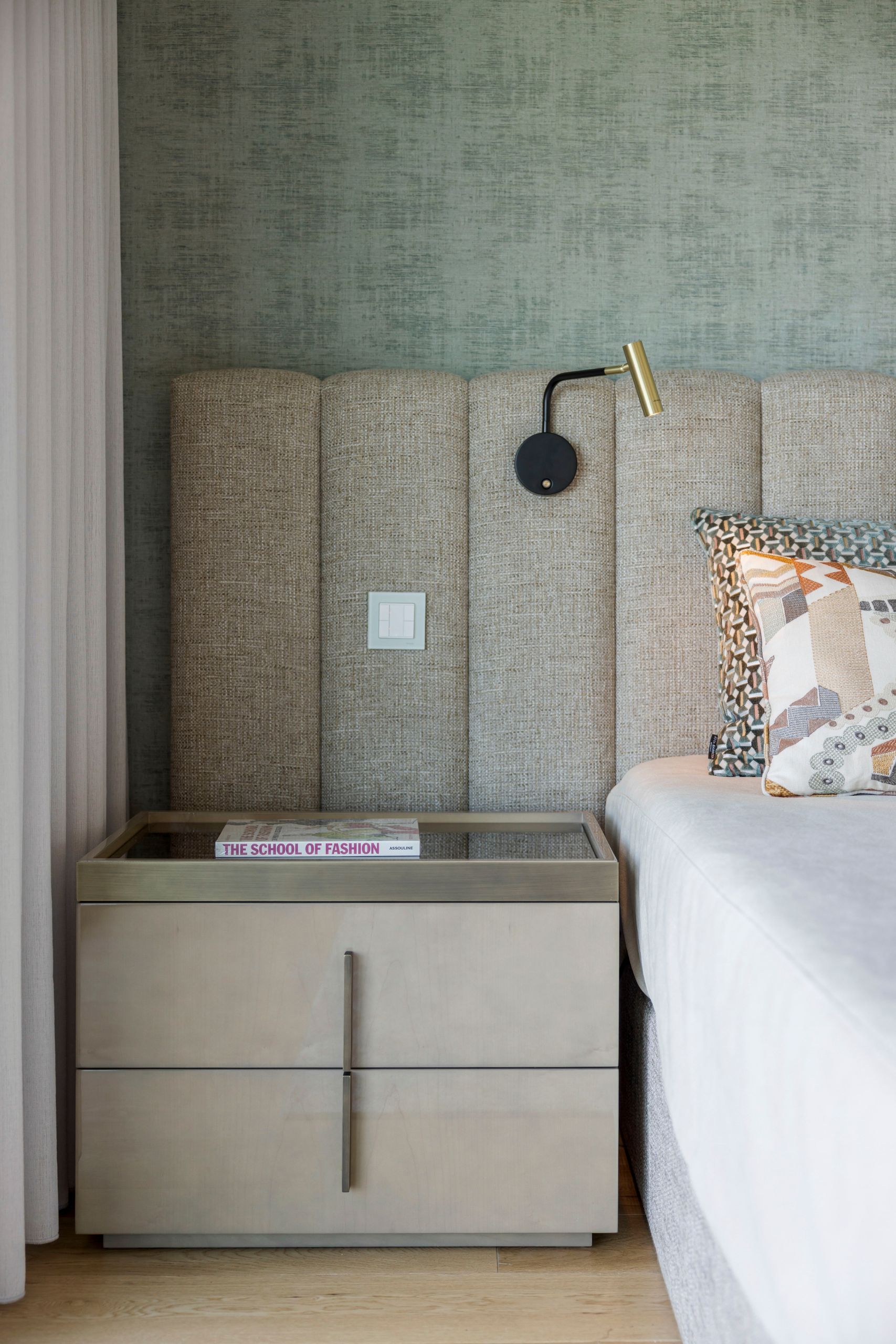 The pairing of the Milos and Kensington night tables reinforces the individuality of the couple’s routines, meeting both sets of needs without compromising the room’s balance. To complement the space, the Her swivel armchair and the Sublime pouf appear as elegant, lightweight choices, offering support without visually overwhelming the room.