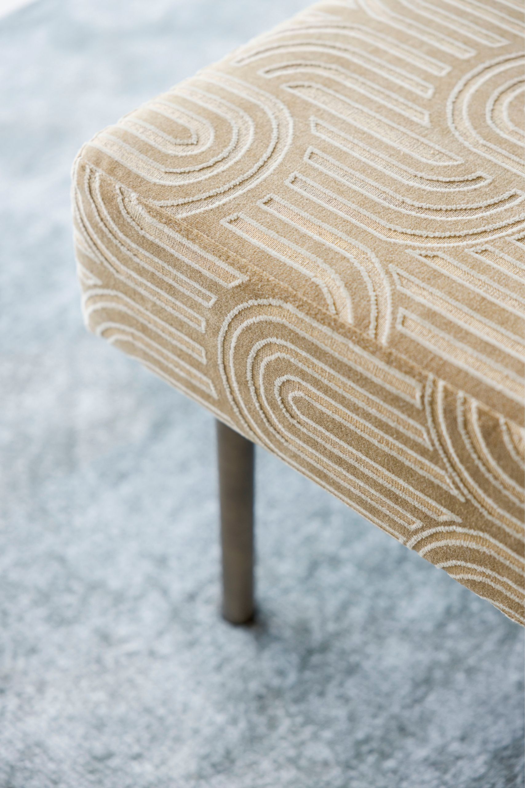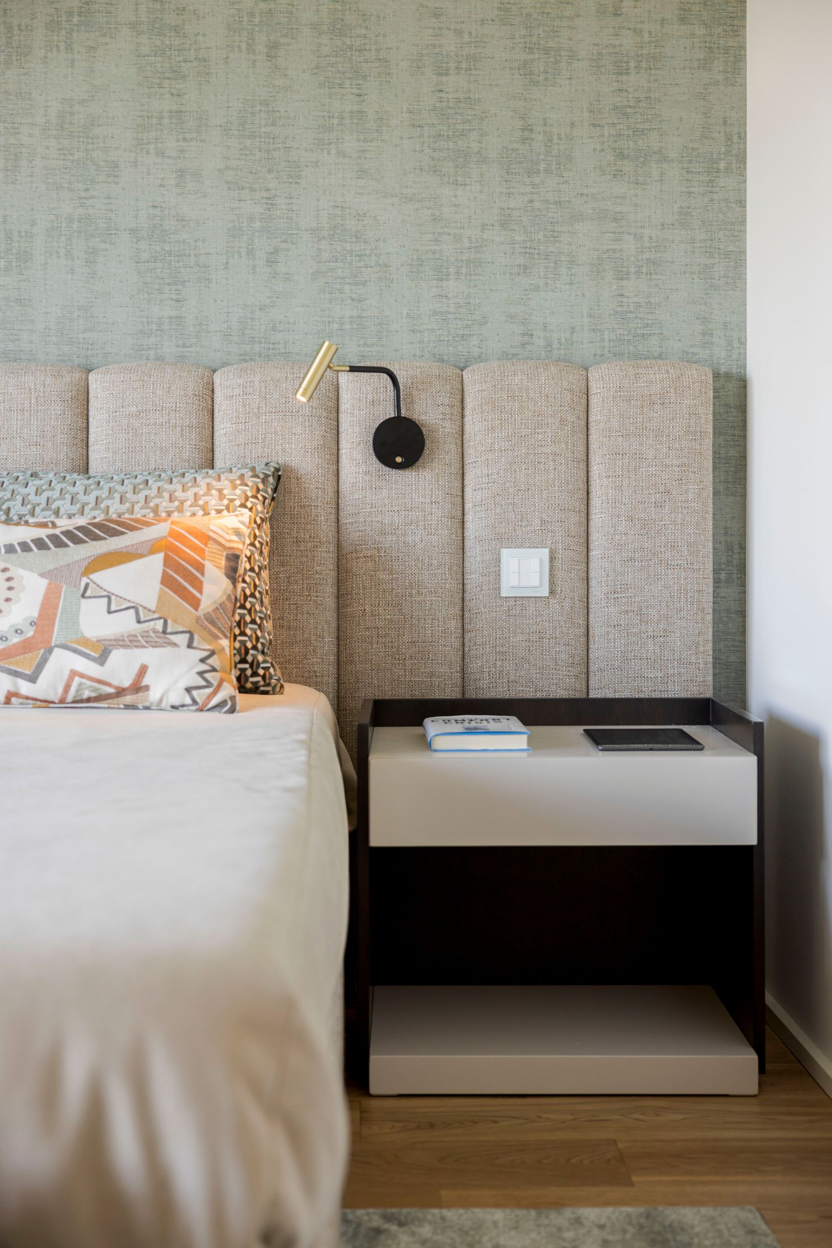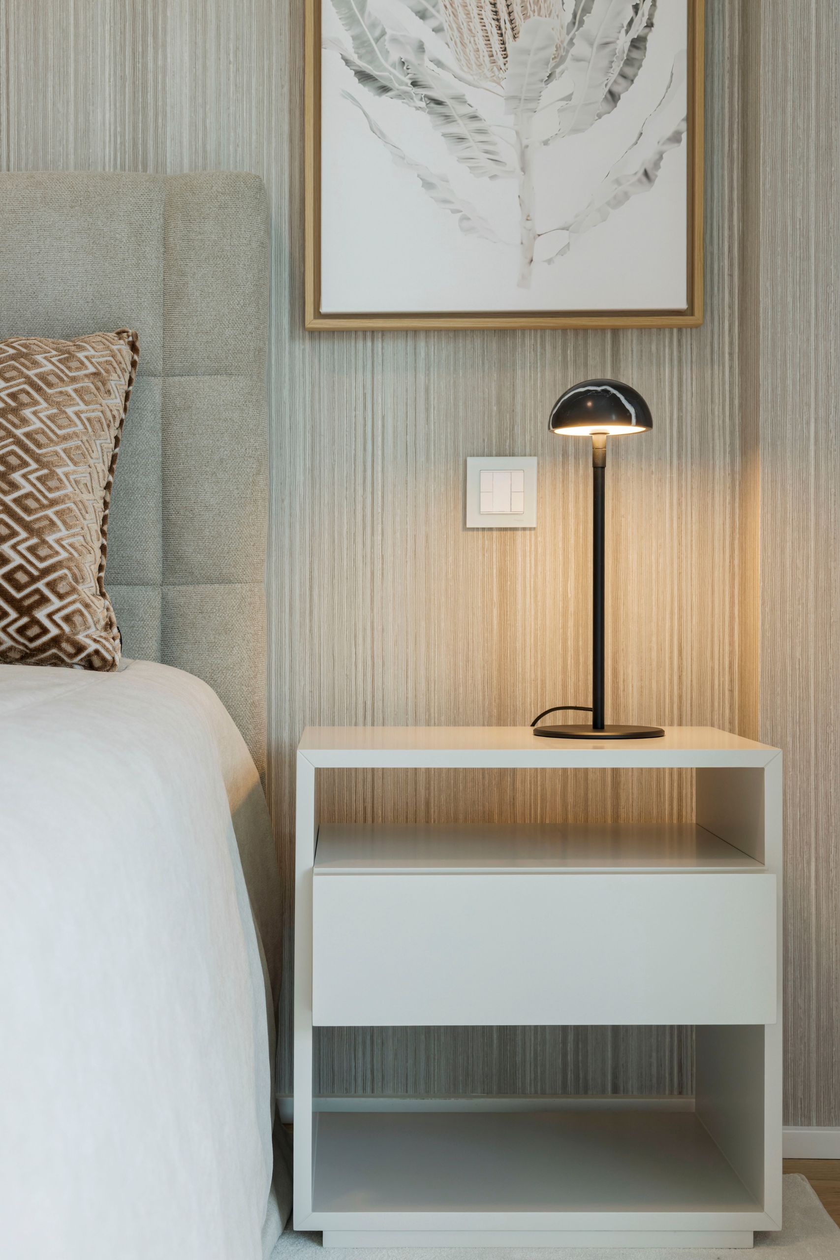 Upon entering, organic contours emerge as the guiding thread of the environment, immediately visible in the Grace bed’s headboard. Its independent slats allow each partner to enjoy personalized comfort without losing closeness. At the foot of the bed, the Florença bench introduces a dynamic touch through its textured fabric with a curved pattern, adding movement to the composition.