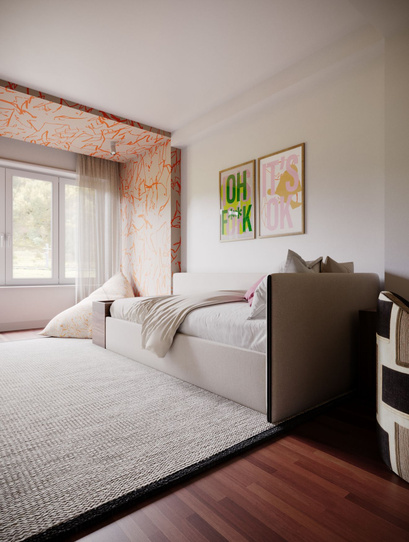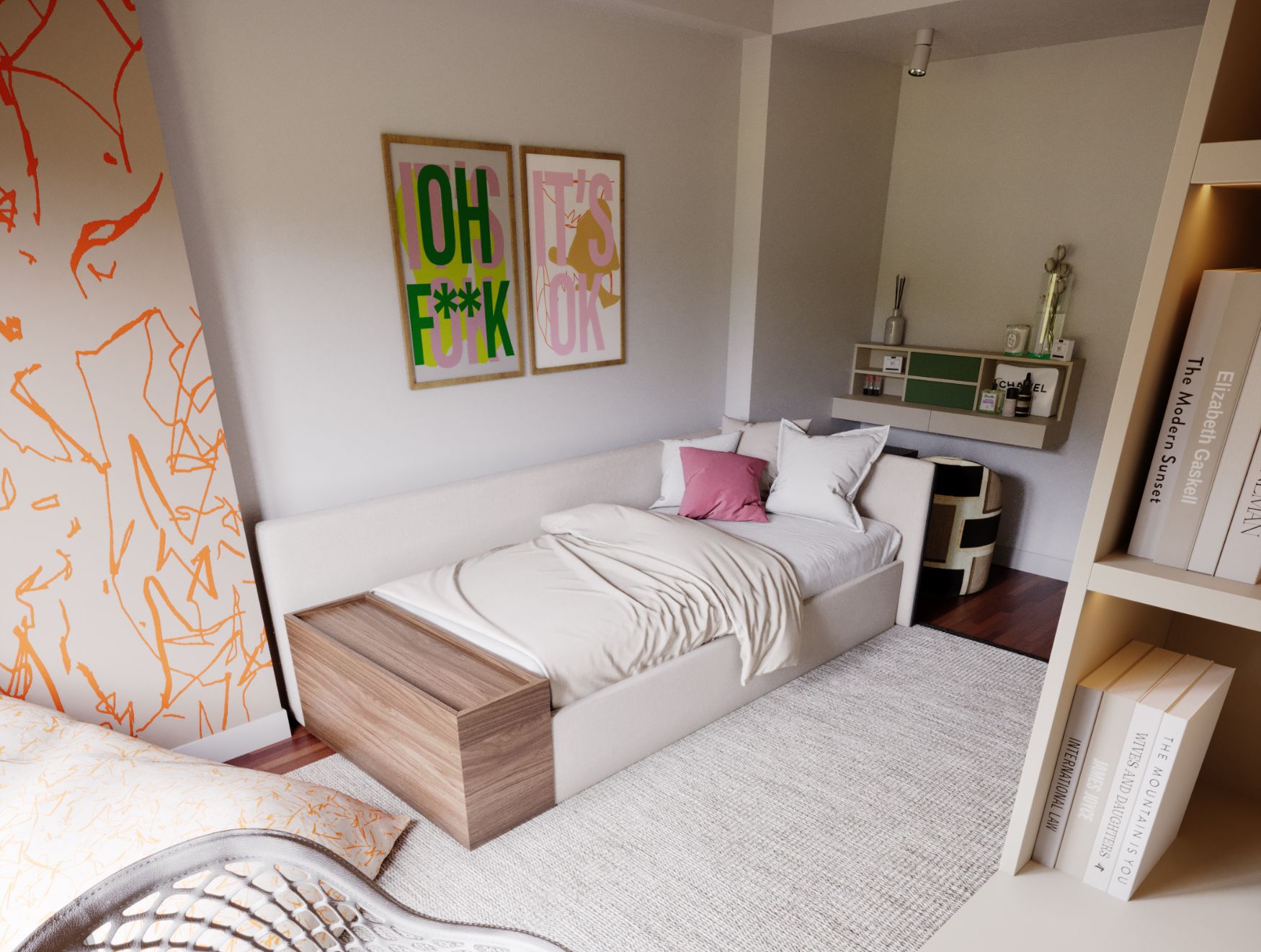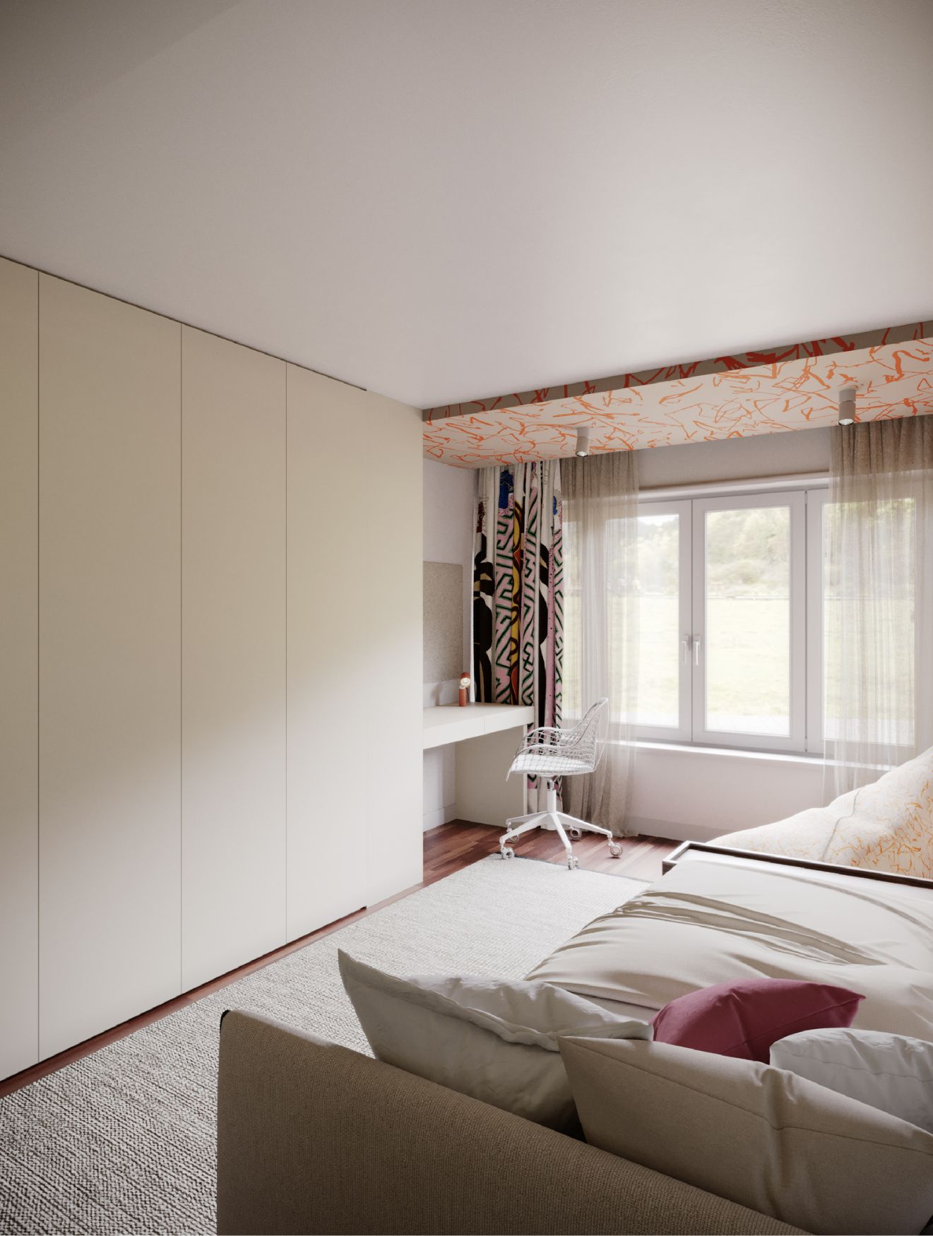 Oferecendo apenas o que é realmente essencial, este quarto conta com inúmeras soluções de arrumação graças ao mobiliário feito à medida. Um armário embutido percorre toda a parede, interrompendo-se apenas para emoldurar um cantinho de estudo, ideal para tardes de concentração ou leituras noturnas.