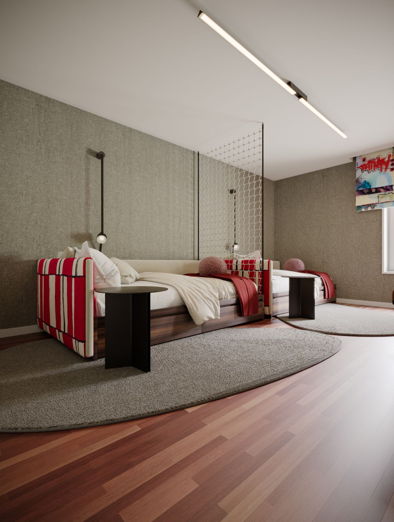 Tal como os irmãos mais velhos, os membros mais jovens da família desfrutam de quartos que refletem a sua personalidade e estilo de vida. No que diz respeito ao design do quarto, a bola estava no seu campo, permitindo que a divisão se tornasse uma verdadeira expressão das suas ambições e paixões – um lugar que os encoraja a alcançar grandes sonhos, tanto dentro como fora do campo.