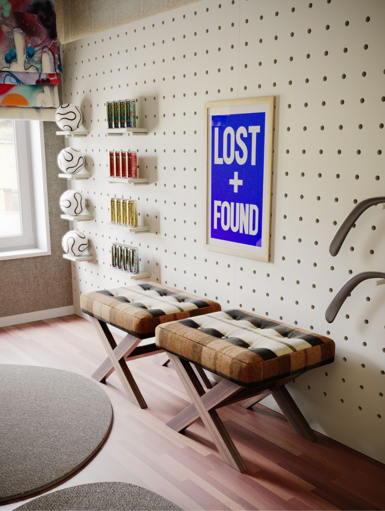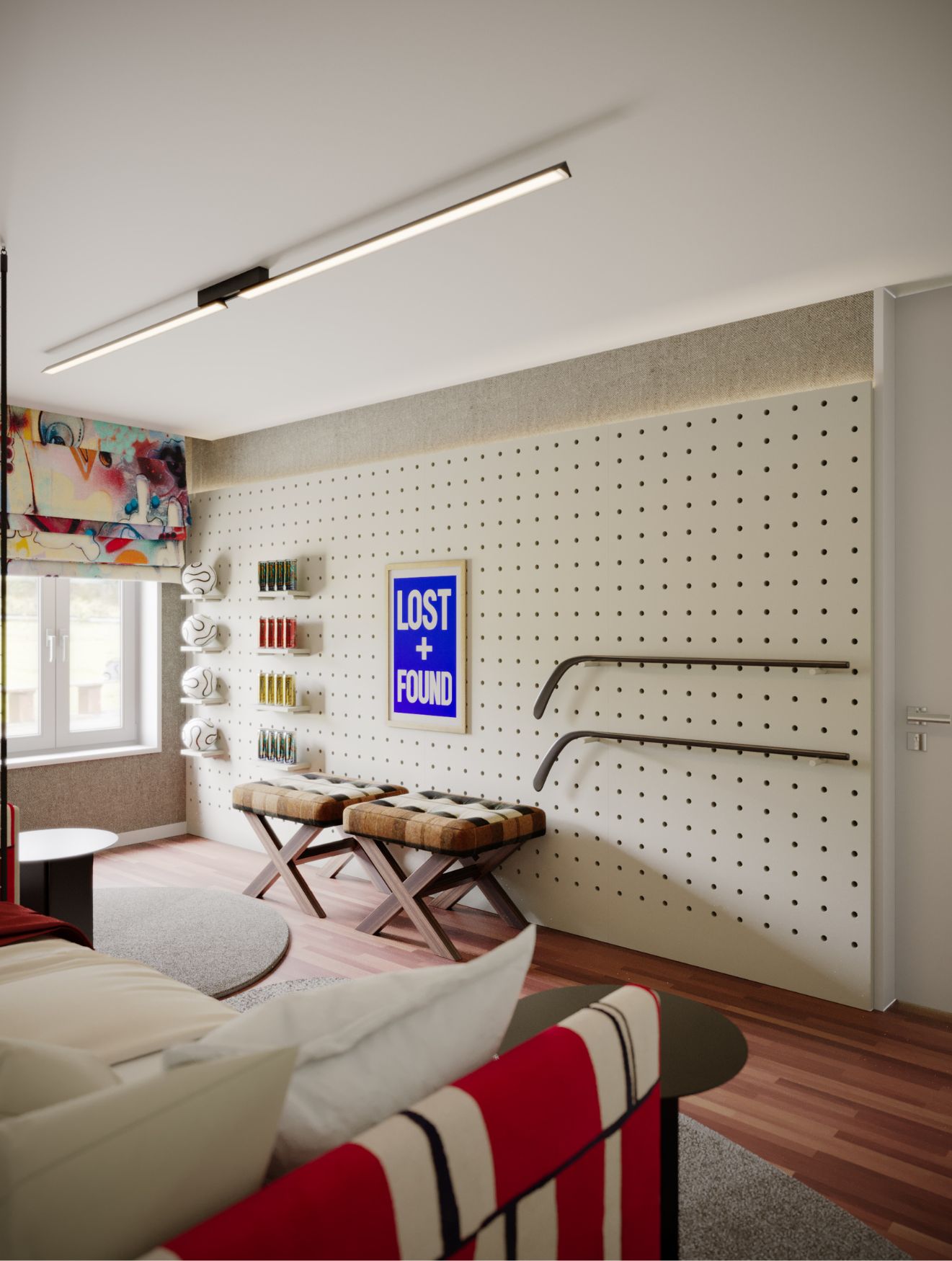 Em frente à cama, sticks de hóquei são reaproveitados como elementos decorativos de parede, enquanto um conjunto de Bancos Bridge oferece assentos adicionais, perfeitos para reuniões de equipa. Cada peça de mobiliário de quarto foi cuidadosamente selecionada, com soluções de mobiliário personalizado a garantir que cada elemento se adapta ao caráter único do quarto.