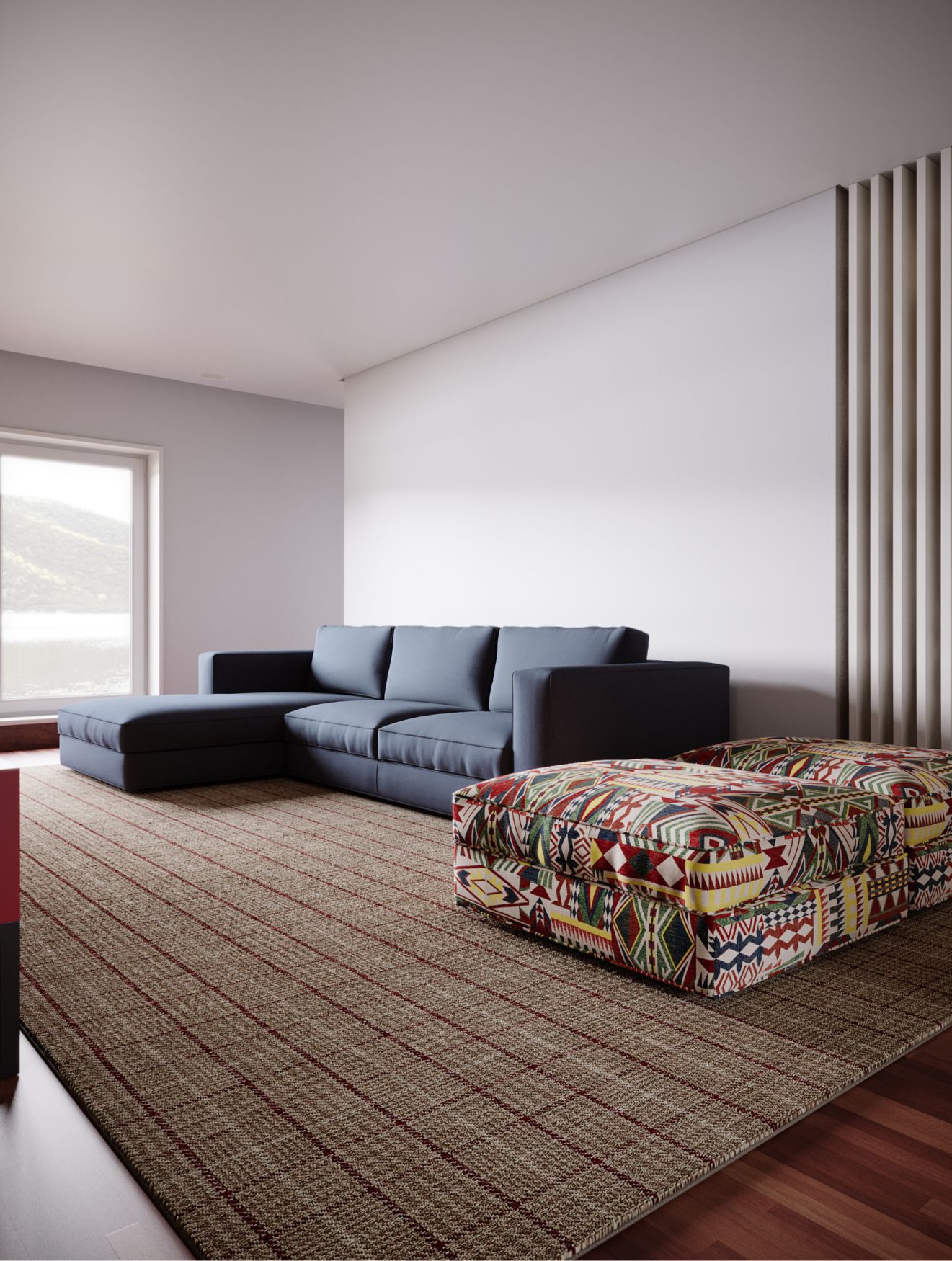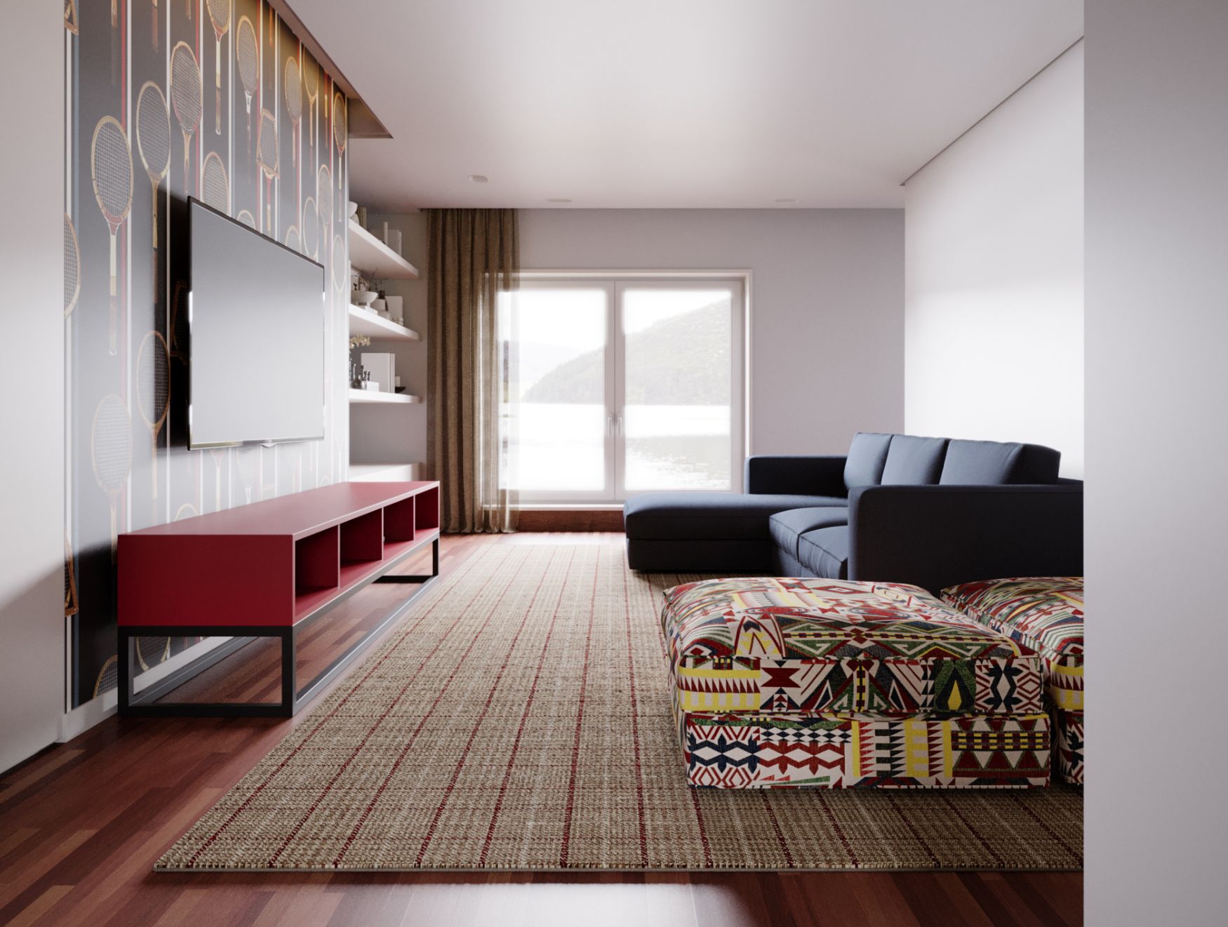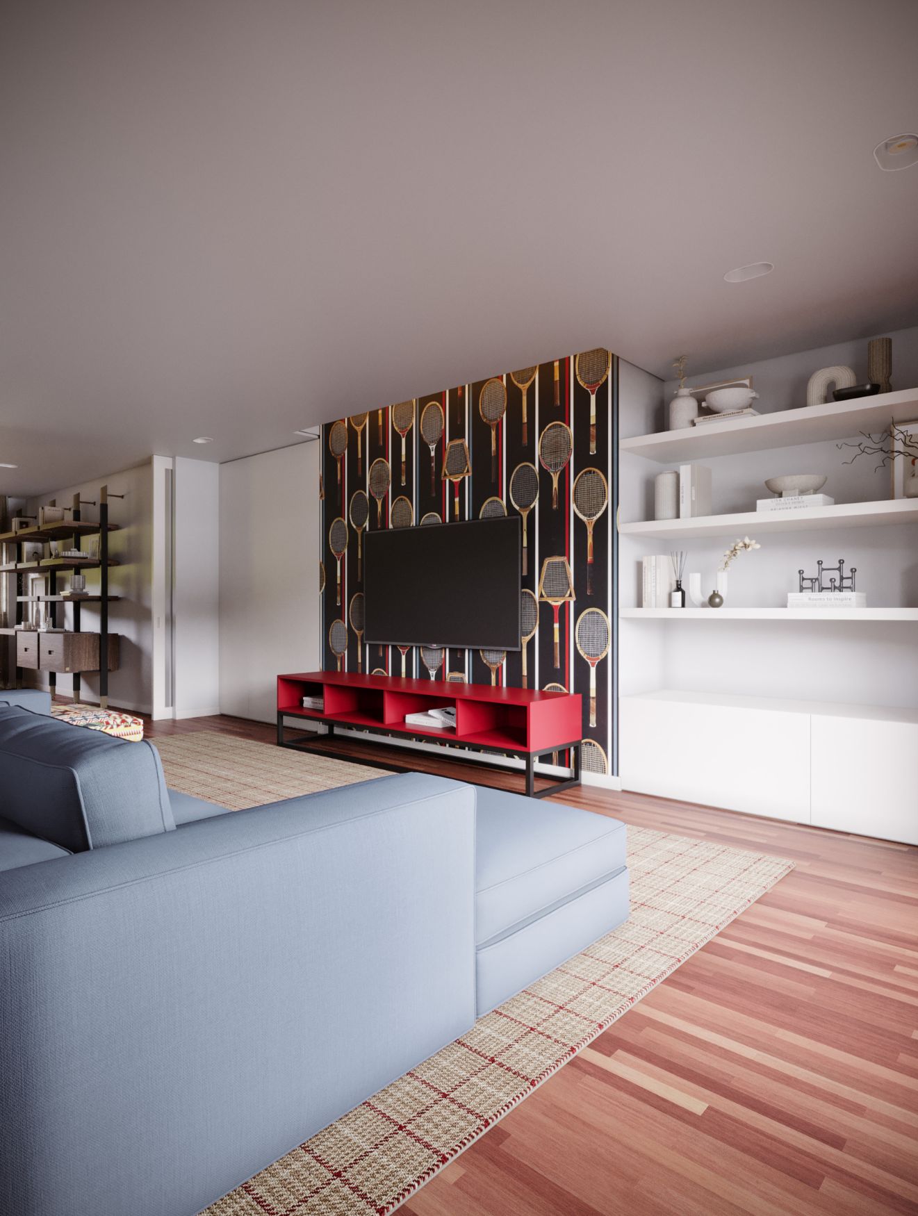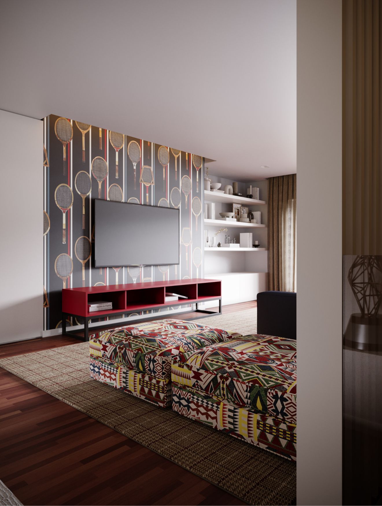 Na parede principal, o papel de parede com figuras de raquetes e finas linhas verticais introduz ritmo visual, ampliando a perceção de altura. Sob a televisão suspensa repousa o móvel de tv Slender, com um acabamento vermelho mate que contrasta com a base preta e adiciona energia ao conjunto.