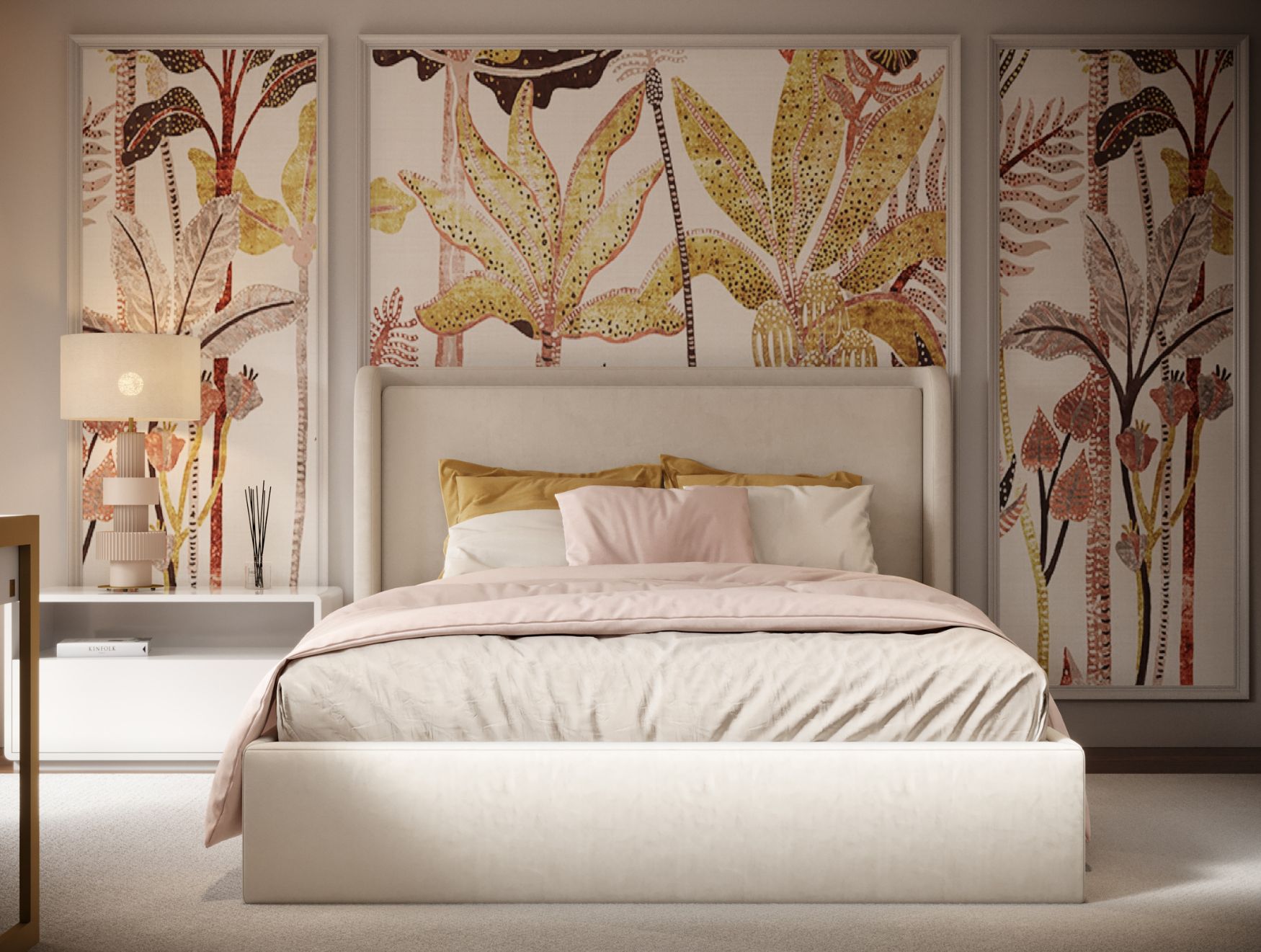A decoração de quarto vibra com uma energia ritmada, guiada pelo papel de parede tropical que introduz cor e movimento sem dominar o espaço. A paleta estende‑se naturalmente para a roupa de cama e para a cadeira giratória, que acompanha a secretária adaptada a partir da consola Manhattan, criando um ambiente coeso e cheio de personalidade.