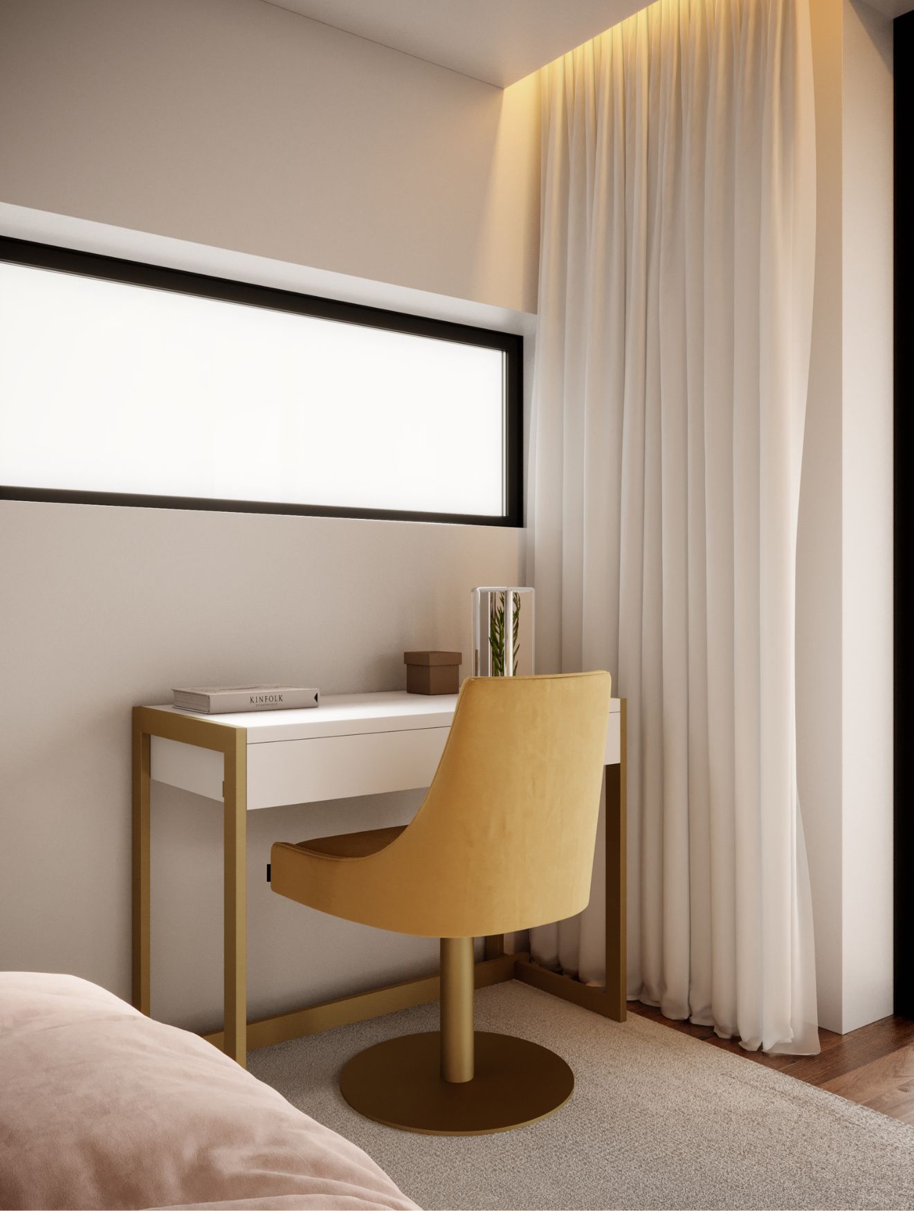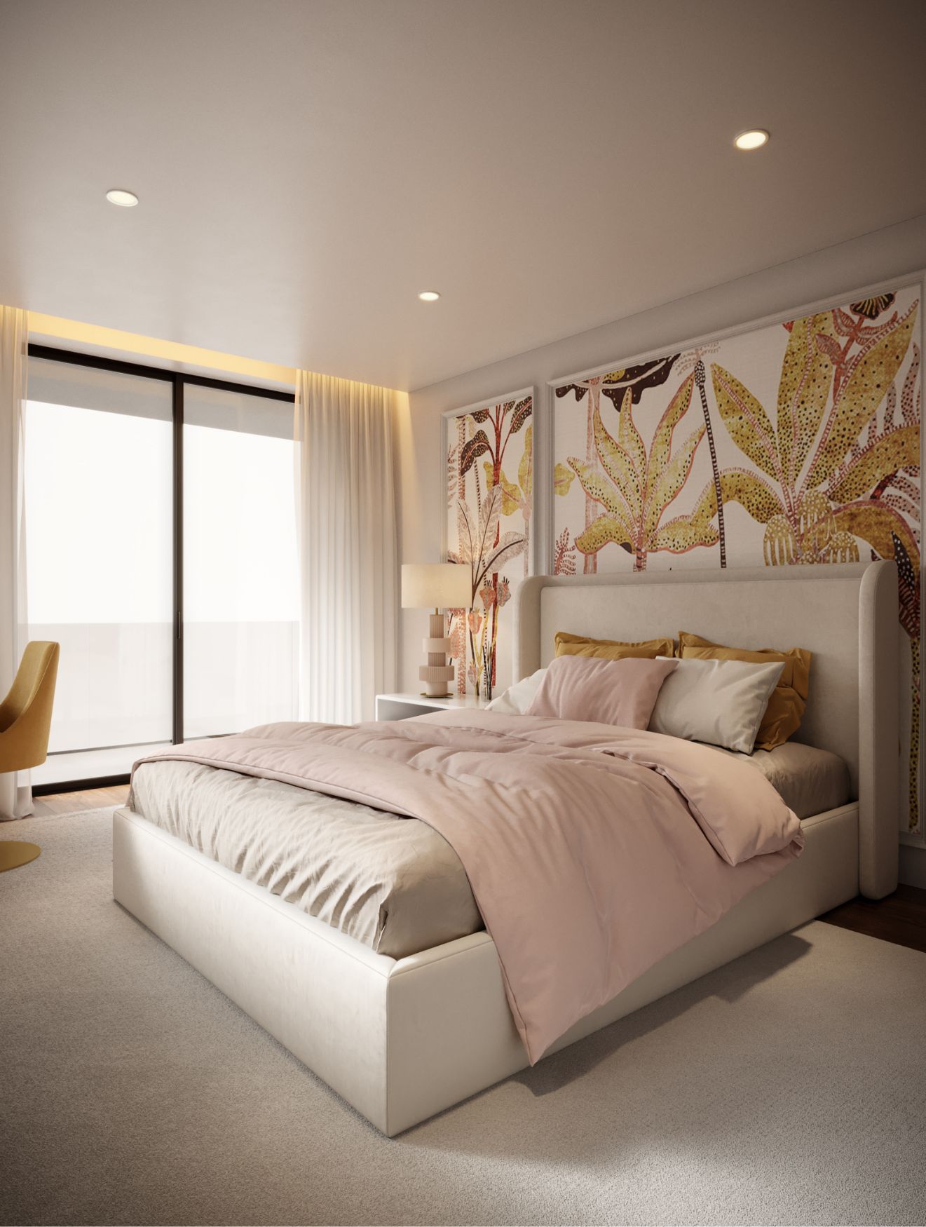 No centro do espaço, a cama Porto estabelece o ponto de equilíbrio entre conforto e leveza, acompanhada por uma única mesa de cabeceira da coleção Sevilha, onde um candeeiro de base marcante reforça a personalidade do espaço. A decoração de quarto mantém-se harmoniosa e funcional, oferecendo tudo o que uma jovem possa precisar para descansar, estudar ou desfrutar de momentos de lazer.