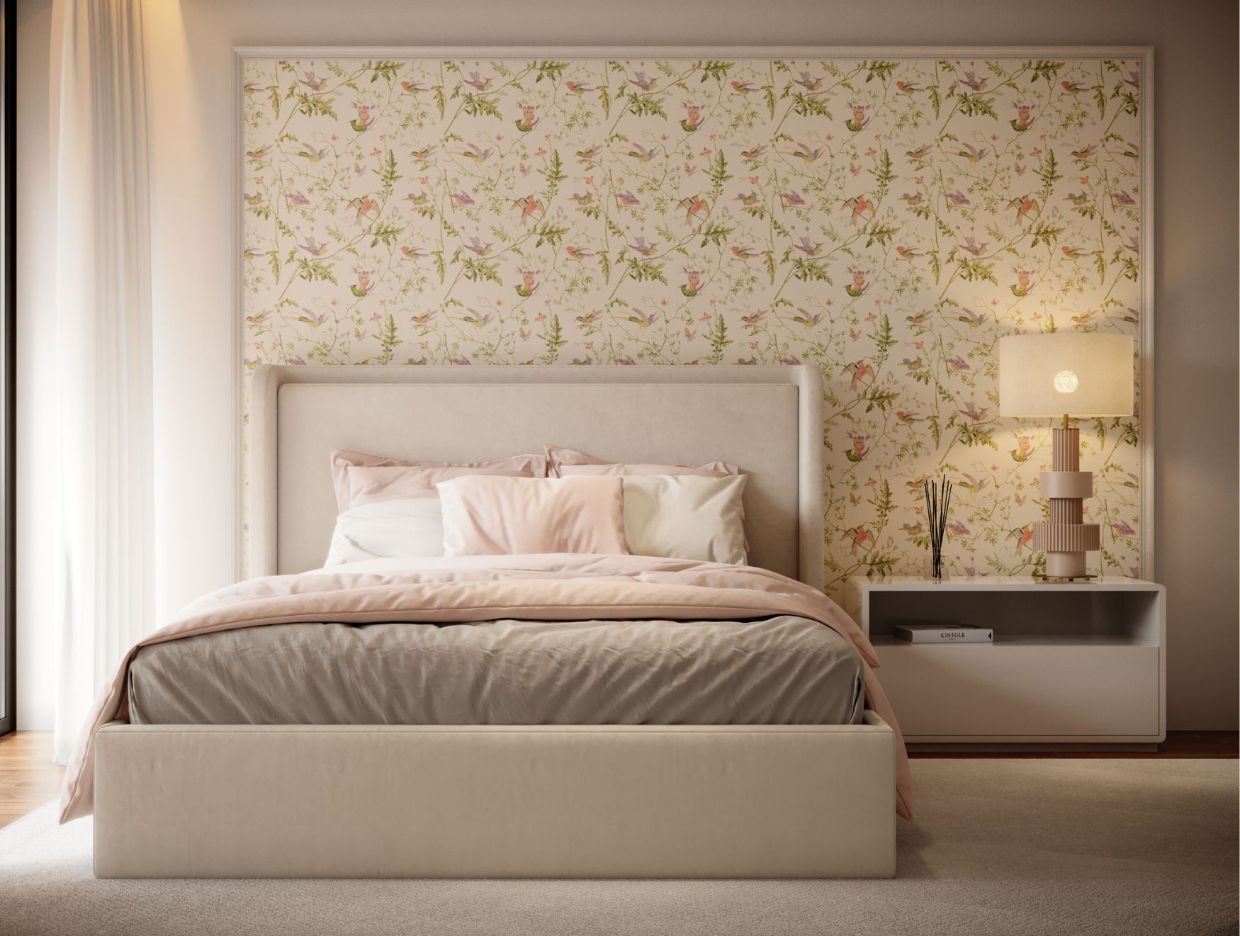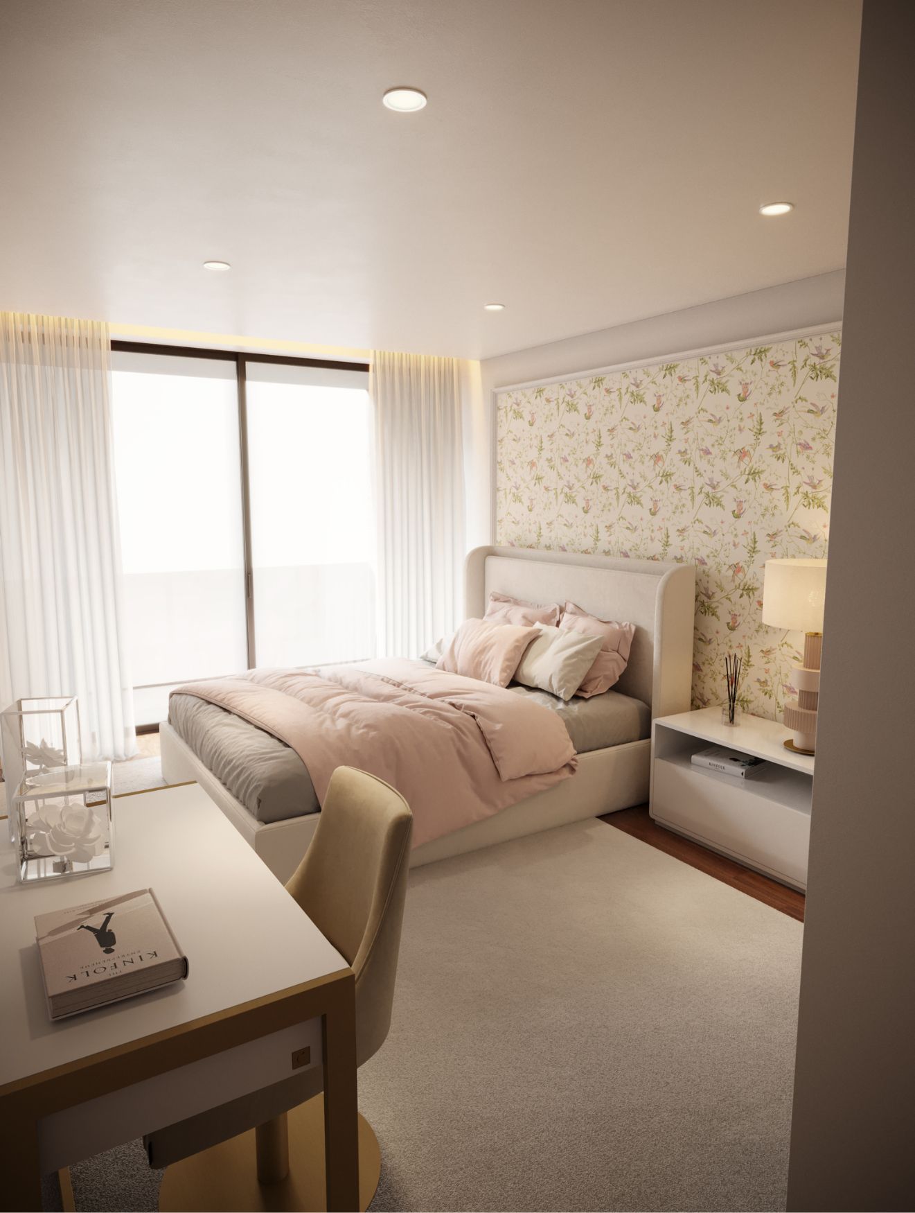 Esta decoração de quarto revela uma energia delicada e feminina, marcada pelo padrão florido que reveste a parede principal e define de imediato a estética do ambiente. A cama Porto, com o seu acabamento acolchoado, introduz conforto imediato, enquanto a mesa de cabeceira Sevilha oferece apoio sem perturbar a leveza do espaço.