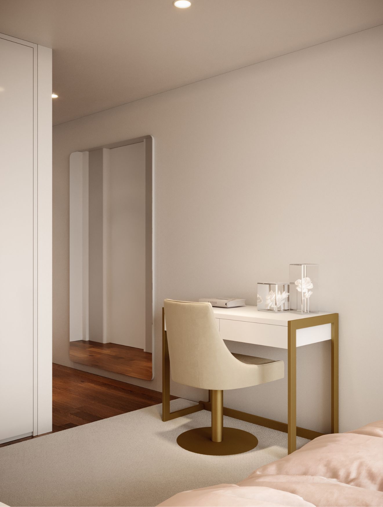 Do lado oposto, a área de estudo foi pensada para acompanhar o ritmo diário da jovem, com uma secretária adaptada a partir da consola Manhattan e uma cadeira giratória que permite movimentos livres e naturais. A decoração de quarto mantém‑se coerente e serena, garantindo que cada zona se integra de forma harmoniosa num ambiente pensado para crescer com quem o habita.