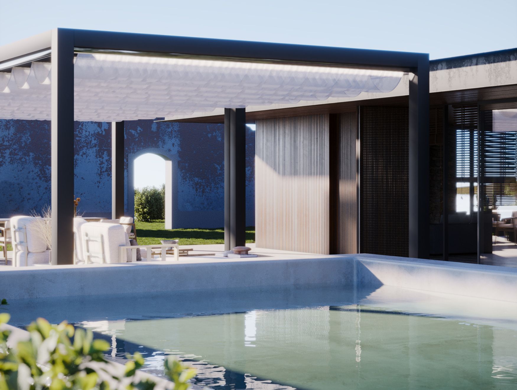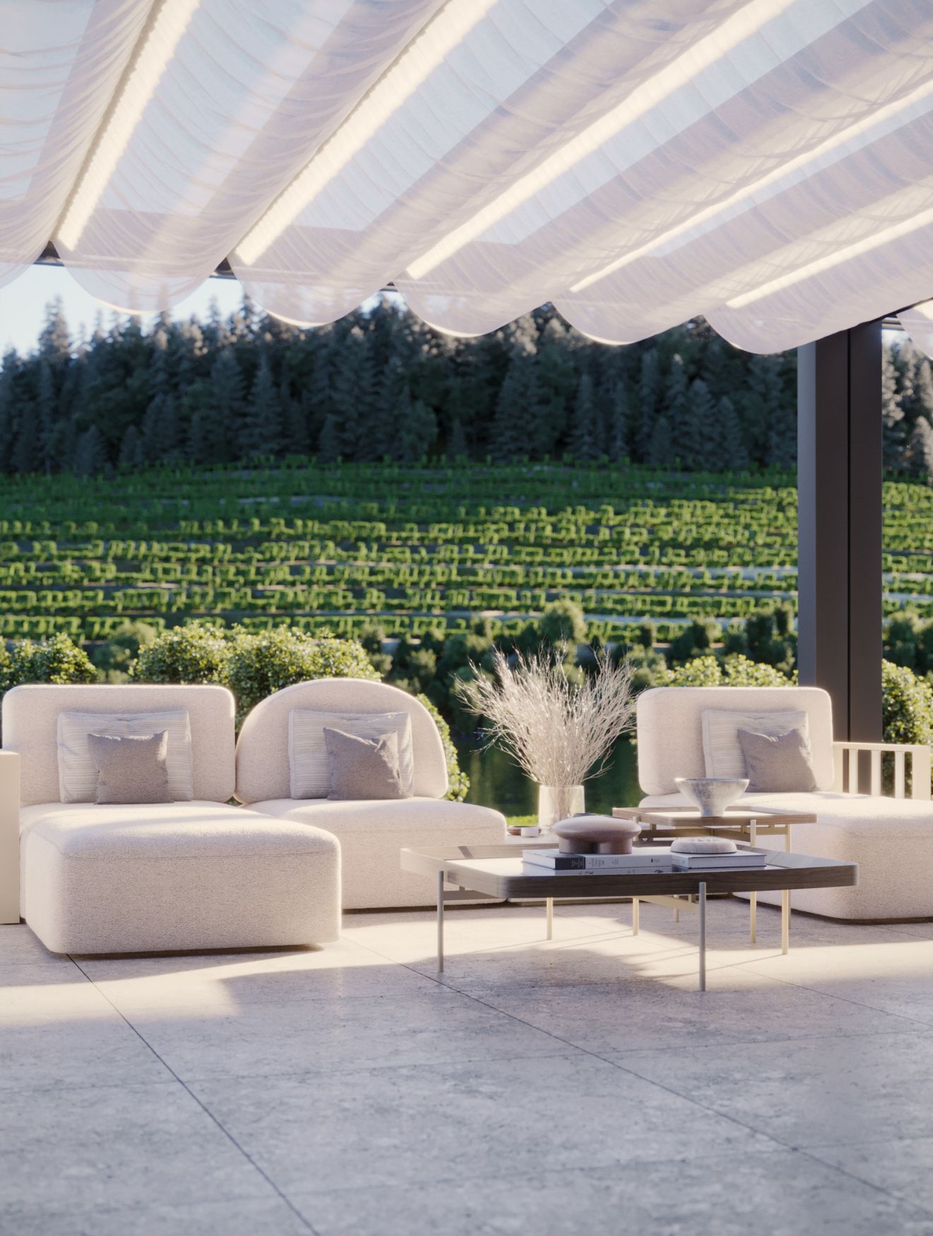 Imagine um lugar onde o descanso é a essência de cada dia e o tempo parece abrandar. Este espaço exterior, dividido em três áreas distintas, reflete uma atmosfera calma e minimalista, realçada pelo verde exuberante da paisagem natural envolvente.