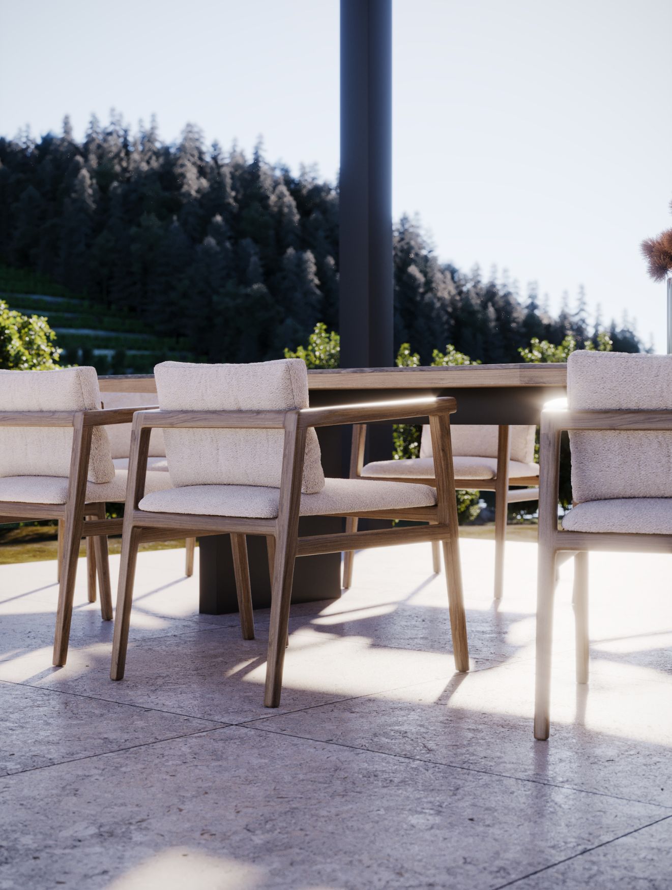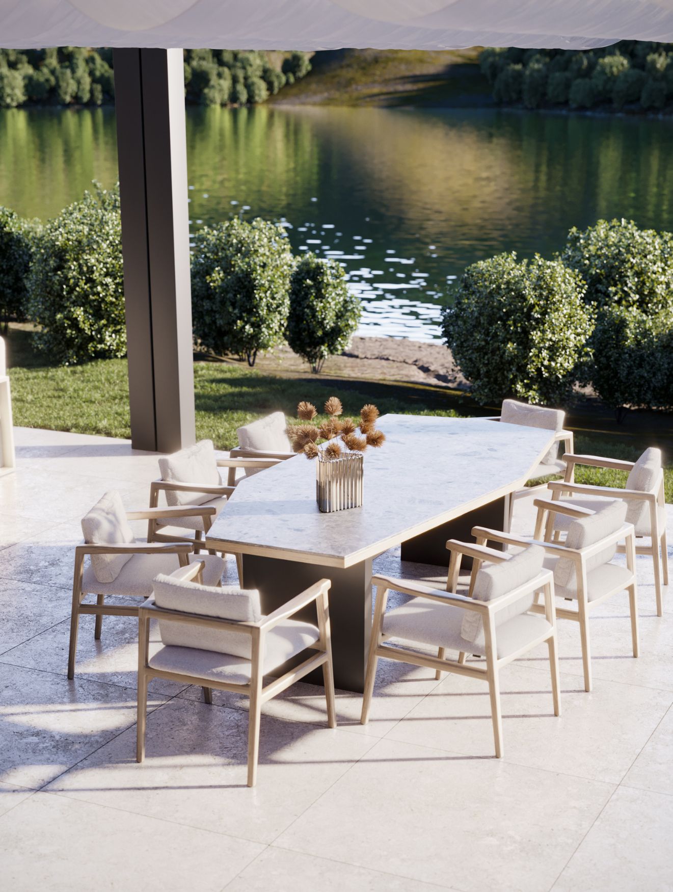 Nesta estação, desfrutar de refeições ao ar livre torna-se quase obrigatório. A mesa de jantar Escarpa, acompanhada pelas cadeiras Toro, cria uma sala de jantar exterior convidativa, onde as cores se fundem harmoniosamente com a vegetação em redor. O conforto e a elegância das peças fazem deste o cenário perfeito para receber amigos e saborear momentos memoráveis, em plena comunhão com a natureza.