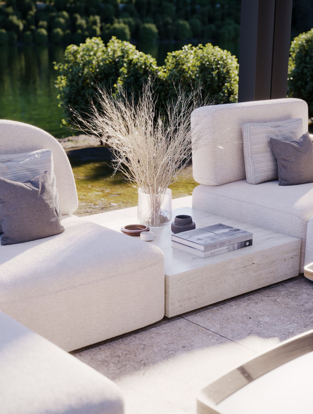 Junto à piscina infinita, um acolhedor espaço de estar ao ar livre destaca-se pelo sofá Her, especialmente adaptado a esta varanda serena. É um convite para se perder em longas conversas com quem mais gosta ou para se deixar envolver pelas páginas de um bom livro. O design modular este sofá permite reconfigurar facilmente a disposição conforme as suas necessidades, oferecendo o equilíbrio ideal entre conforto e versatilidade.