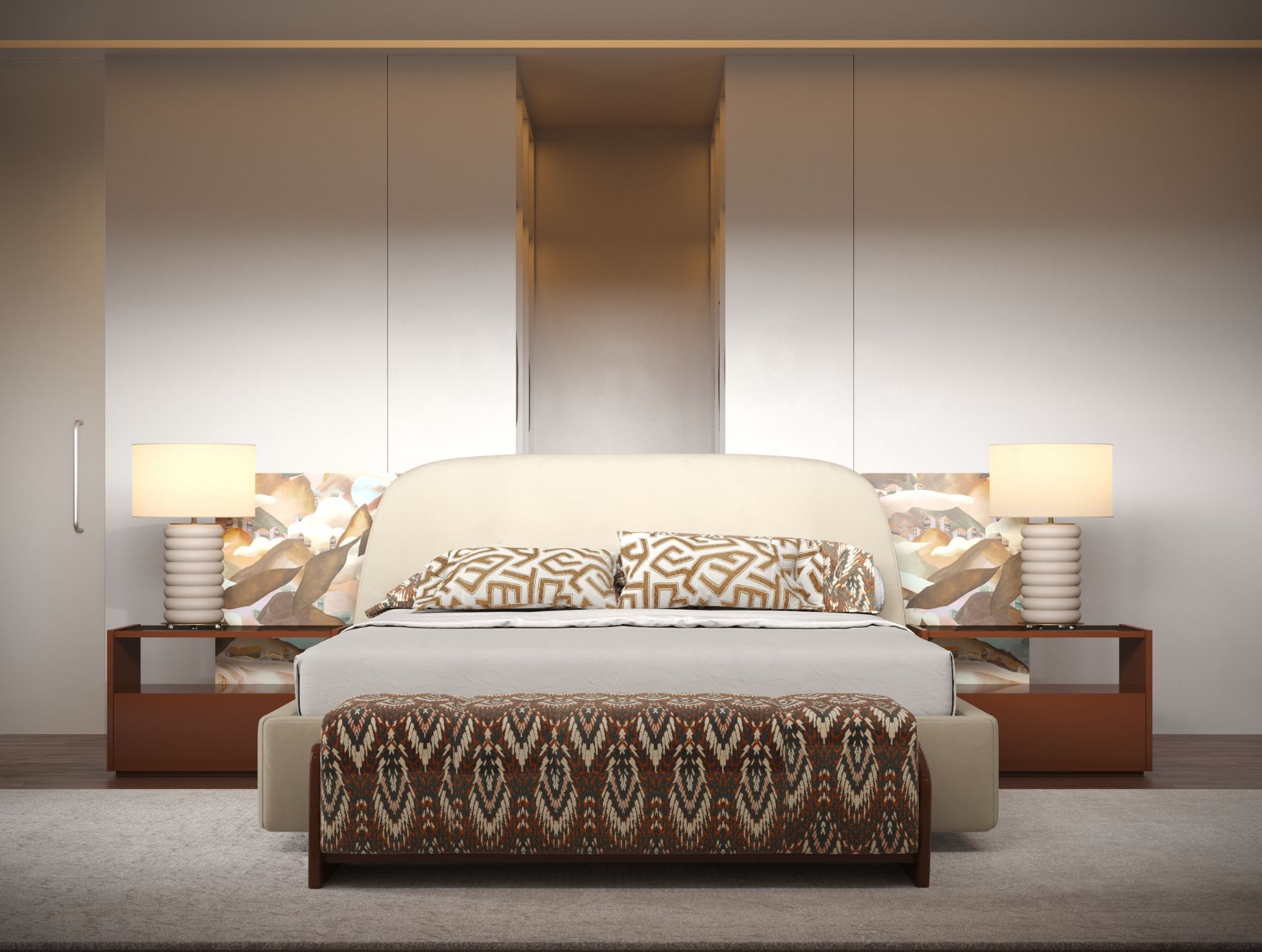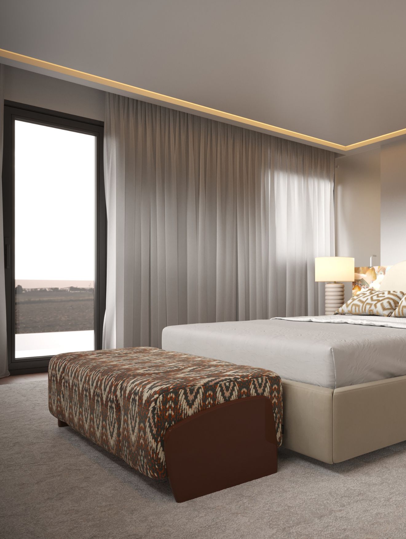 Adicionando uma camada de conforto e requinte, a banqueta Margem, com o seu tecido em padrão de pavão nas cores castanho e bege, traz um toque acolhedor ao quarto. As suas bordas suaves e arredondadas e a estrutura de madeira criam uma peça única que se enquadra perfeitamente na atmosfera sofisticada do ambiente. Esta peça complementa a decoração de quarto e eleva a experiência de repouso.