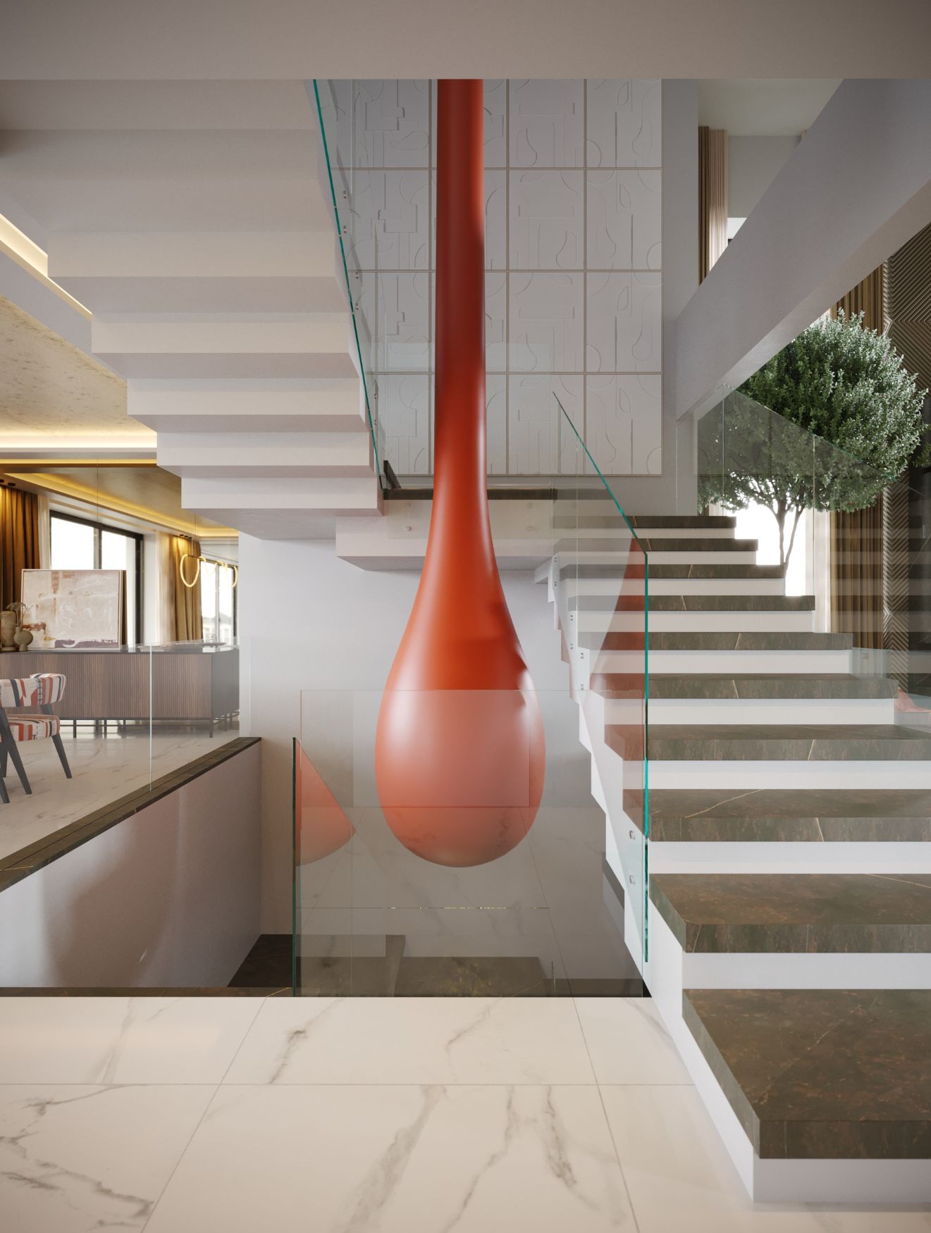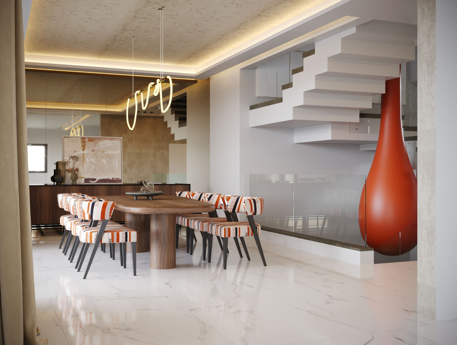 Ecoando a rica herança da Cidade Vermelha, esta moradia de luxo em Marrocos oferece uma combinação única de sofisticação e conforto. Servindo como ponto central da casa, a sala de estar em conceito aberto é um espaço de relaxamento e elegância, onde cada detalhe foi pensado para valorizar tanto a estética como a funcionalidade. Tons suaves e terrosos, aliados ao calor natural da madeira, contrastam com o toque fresco do mármore polido, criando uma atmosfera acolhedora.