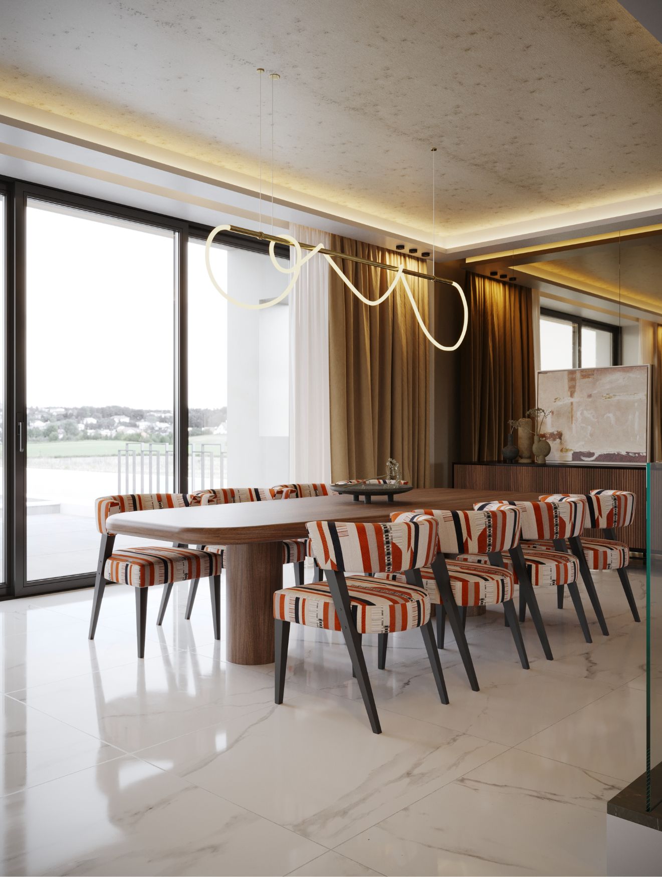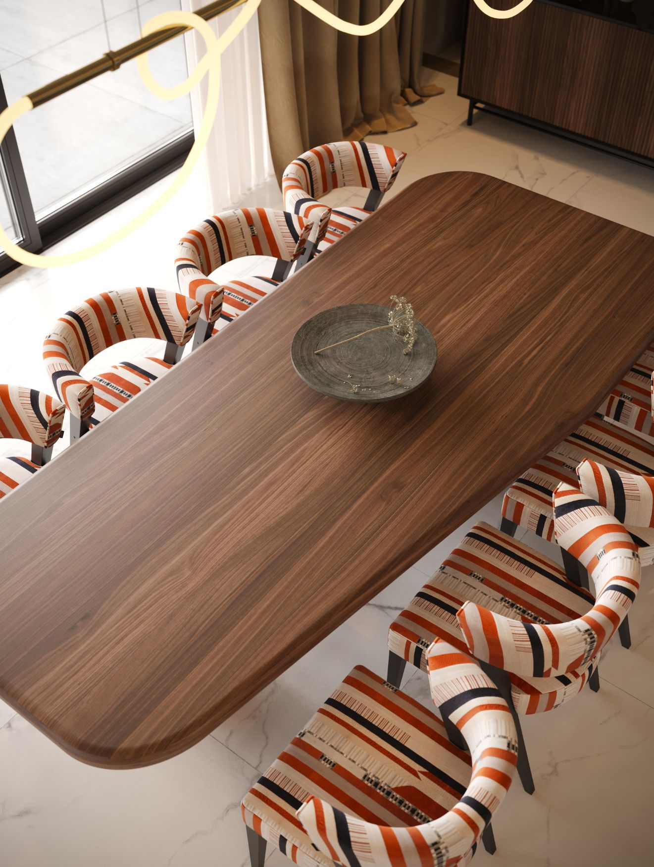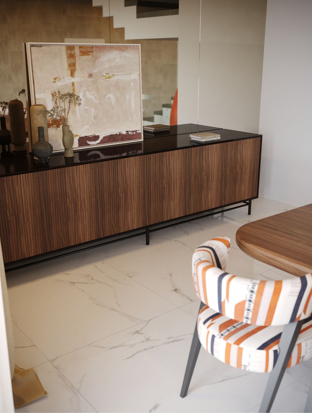 No centro, o sofá Landform, com a sua versatilidade modular, assegura conforto e estilo. A mesa de centro Her, de carácter escultórico, introduz um efeito dinâmico de camadas, acrescentando personalidade e profundidade ao ambiente. A potenciar a funcionalidade do espaço, o aparador Club destaca-se pelos seus detalhes estriados, oferecendo o equilíbrio perfeito entre arrumação e sofisticação. A completar o conjunto, a console baixa Her, com a sua estrutura elegante em bronze e tampo em mármore, acrescenta o toque final de esplendor discreto.