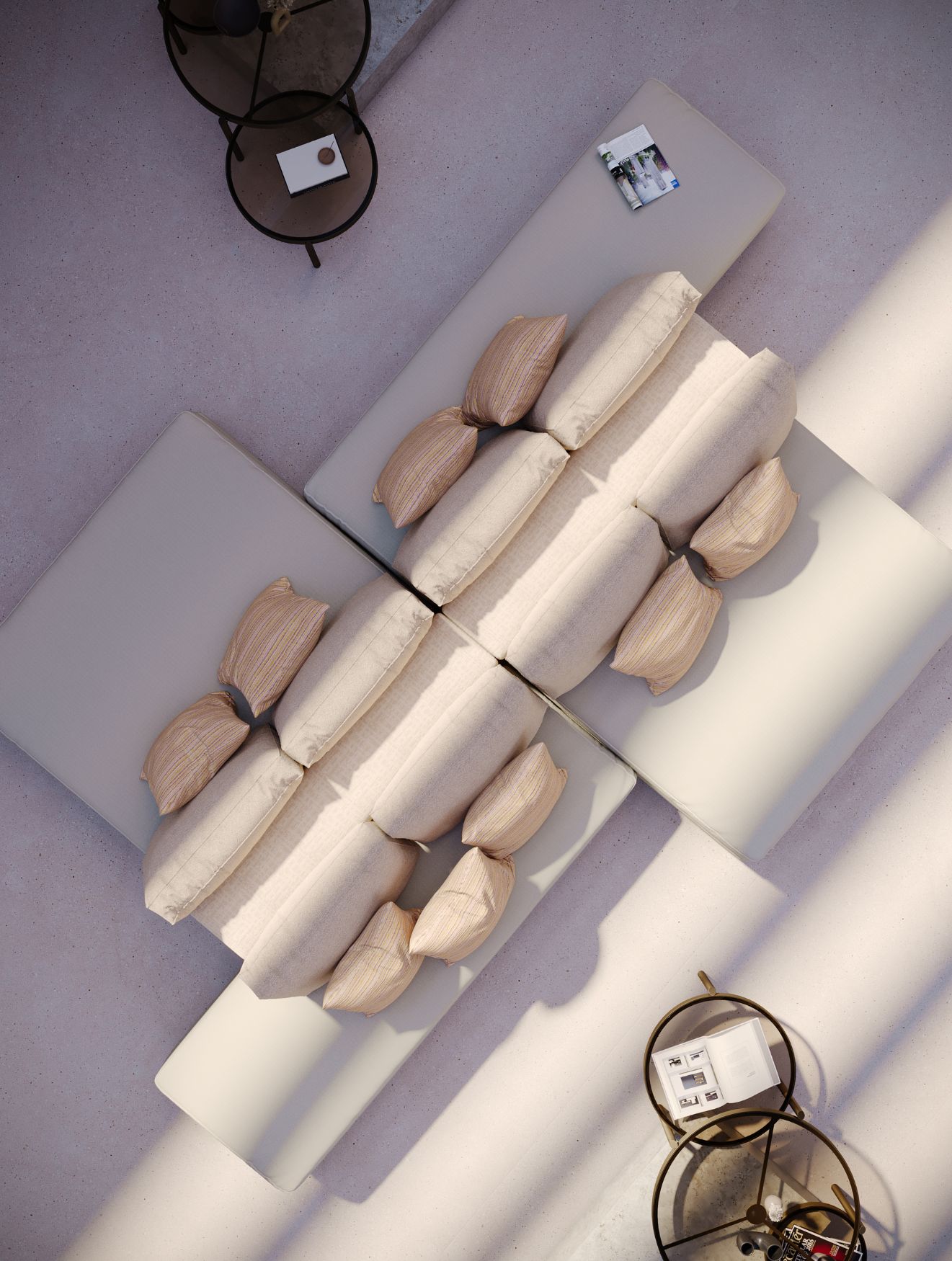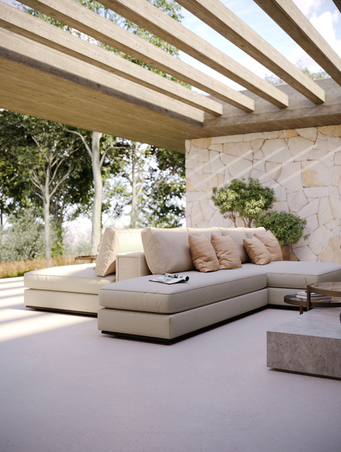 A estrutura robusta do sofá modular Sublime confere-lhe personalidade, bem como o seu design modular. Combinando a mesa de centro Her, uma peça que reflete a estética de uma mesa de centro de luxo refinado, e o cadeirão Passione, este conjunto traz um toque de elegância interior para um ambiente exterior.