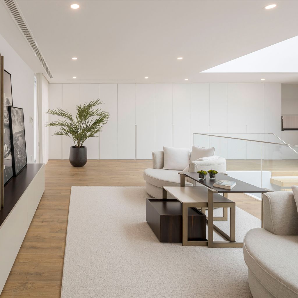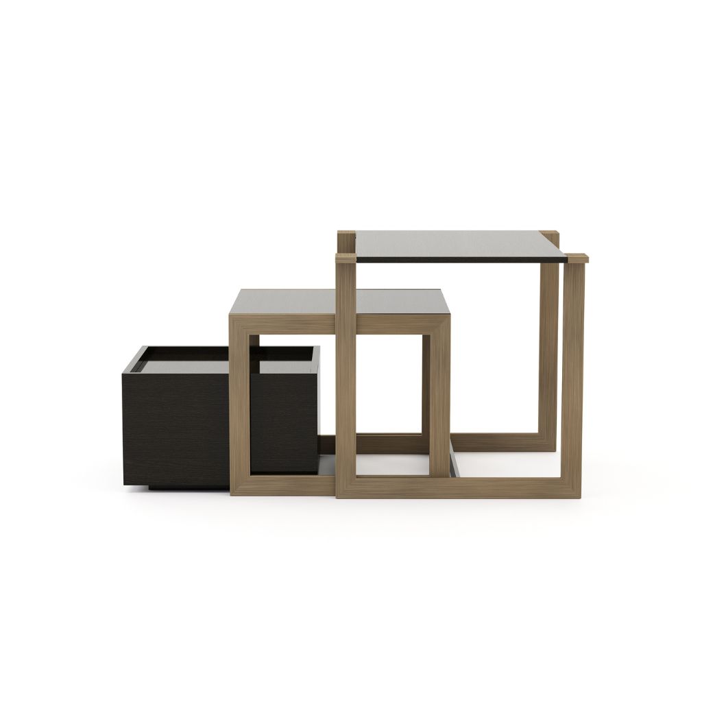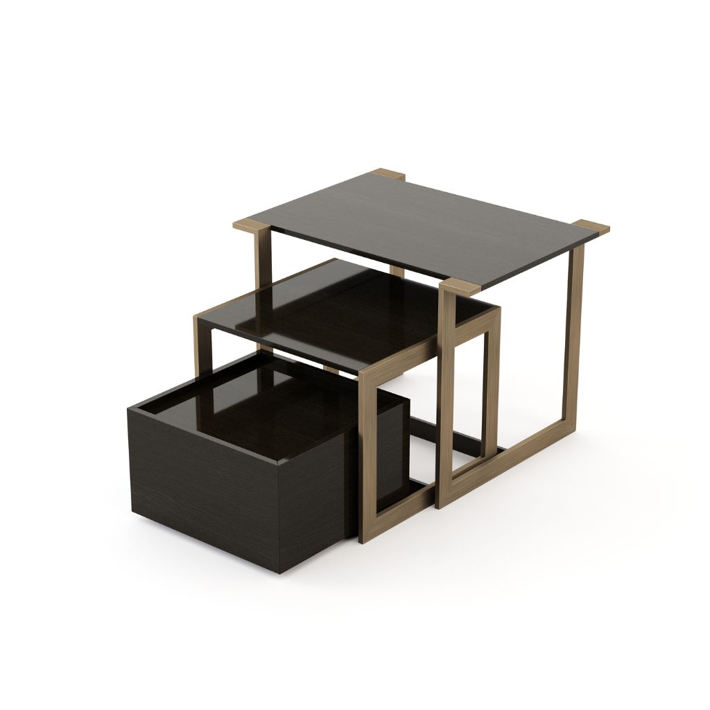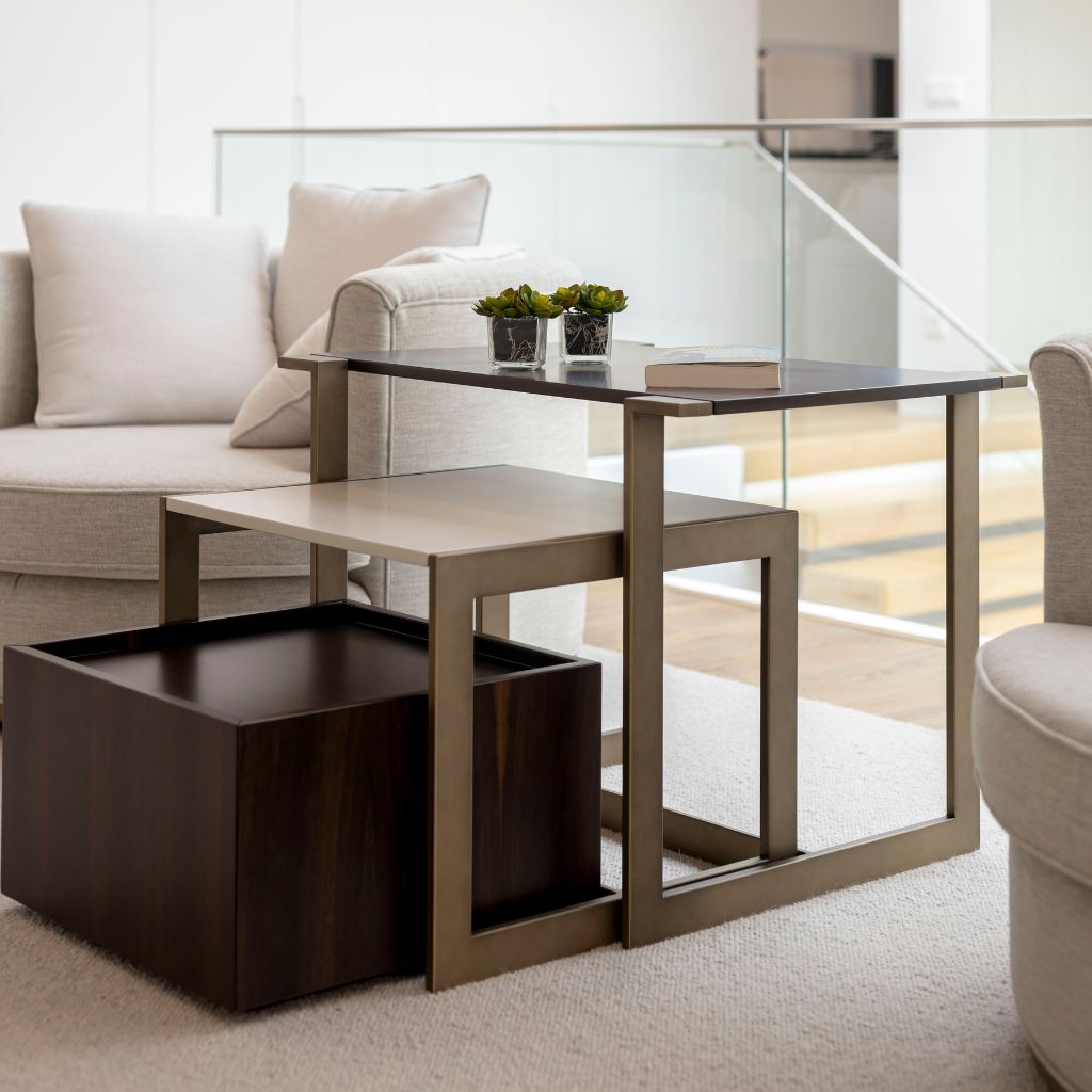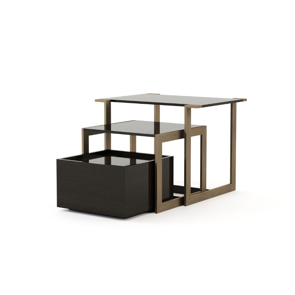 Versátil e modular, a mesa de apoio Fortune permite conjugar materiais e acabamentos com intenção, criando uma peça verdadeiramente única. A estrutura em latão bronze escovado contrasta com o tom natural dos tampos e a gaveta em carvalho escuro alto brilho, elevando a decoração discretamente.
