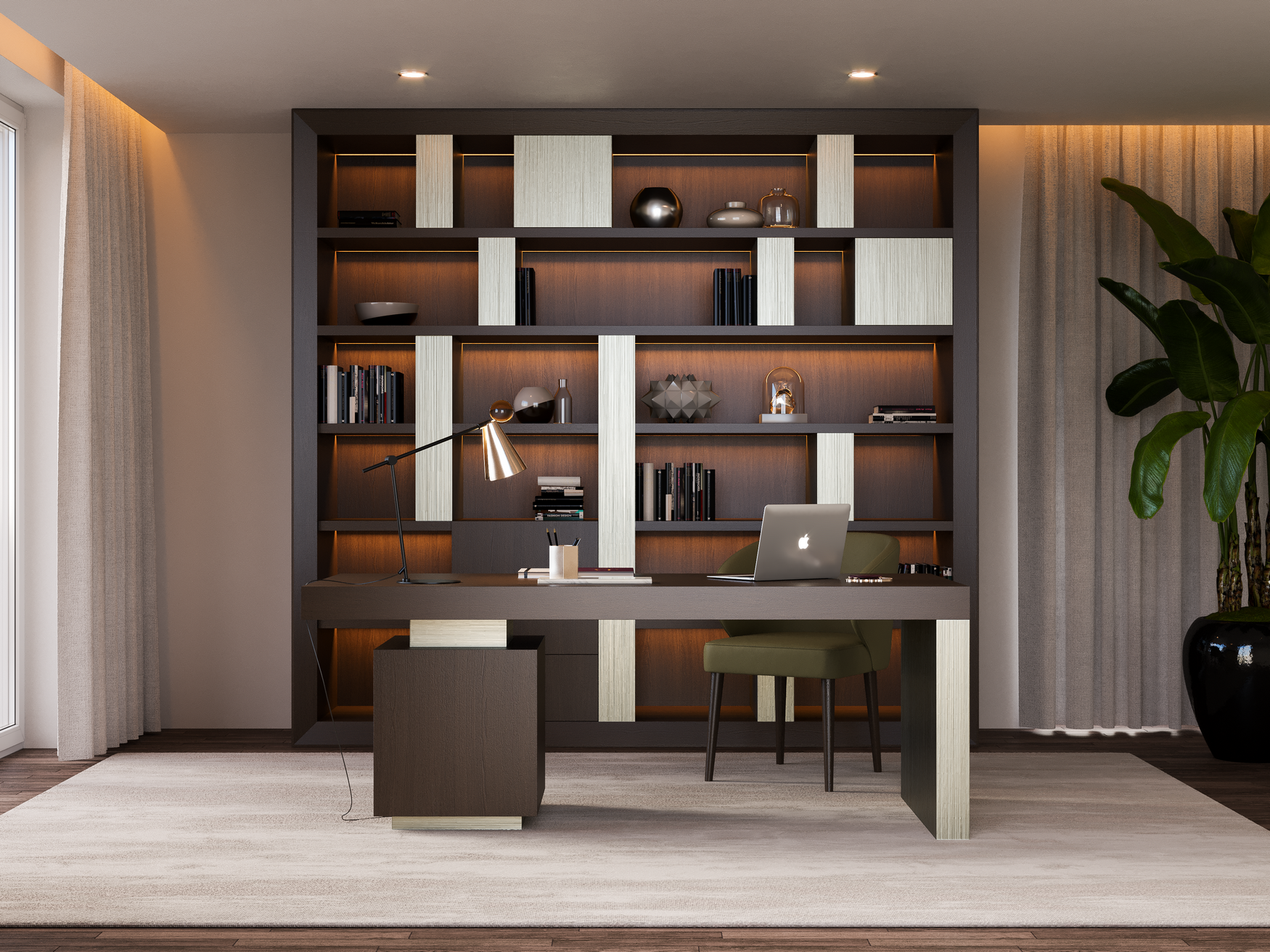 Uma peça que combina carvalho escurecido com base lacada em bronze, que evidenciam o design contemporâneo da secretária.