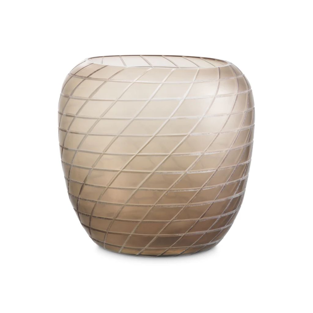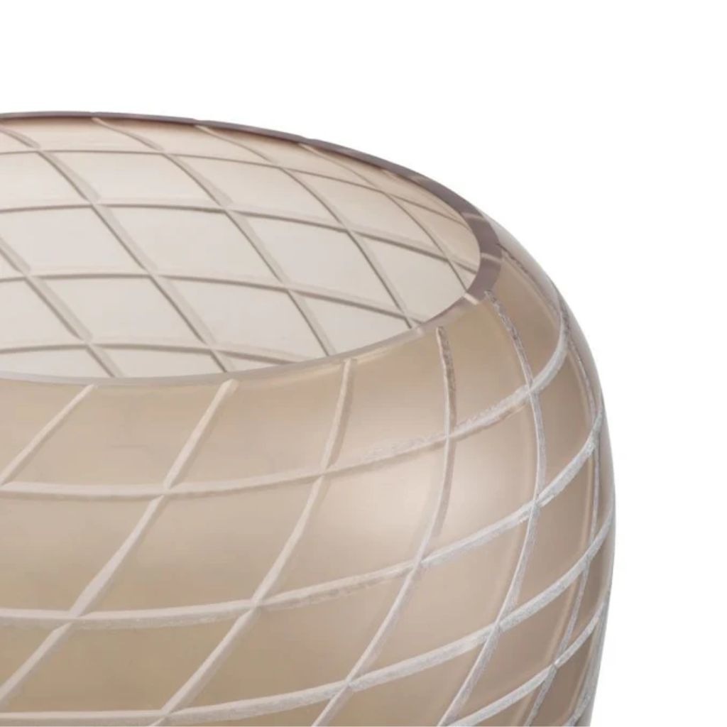 Soprado à mão em vidro reciclado, este vaso distingue-se pelo padrão talhado manualmente, que desenha uma malha delicada sobre a forma arredondada. O acabamento mate reduz o brilho e valoriza a textura, reforçando o carácter artesanal e a elegância subtil da peça.